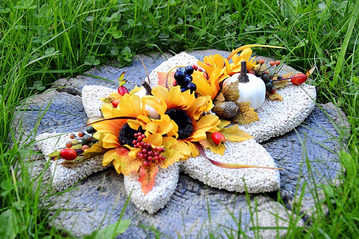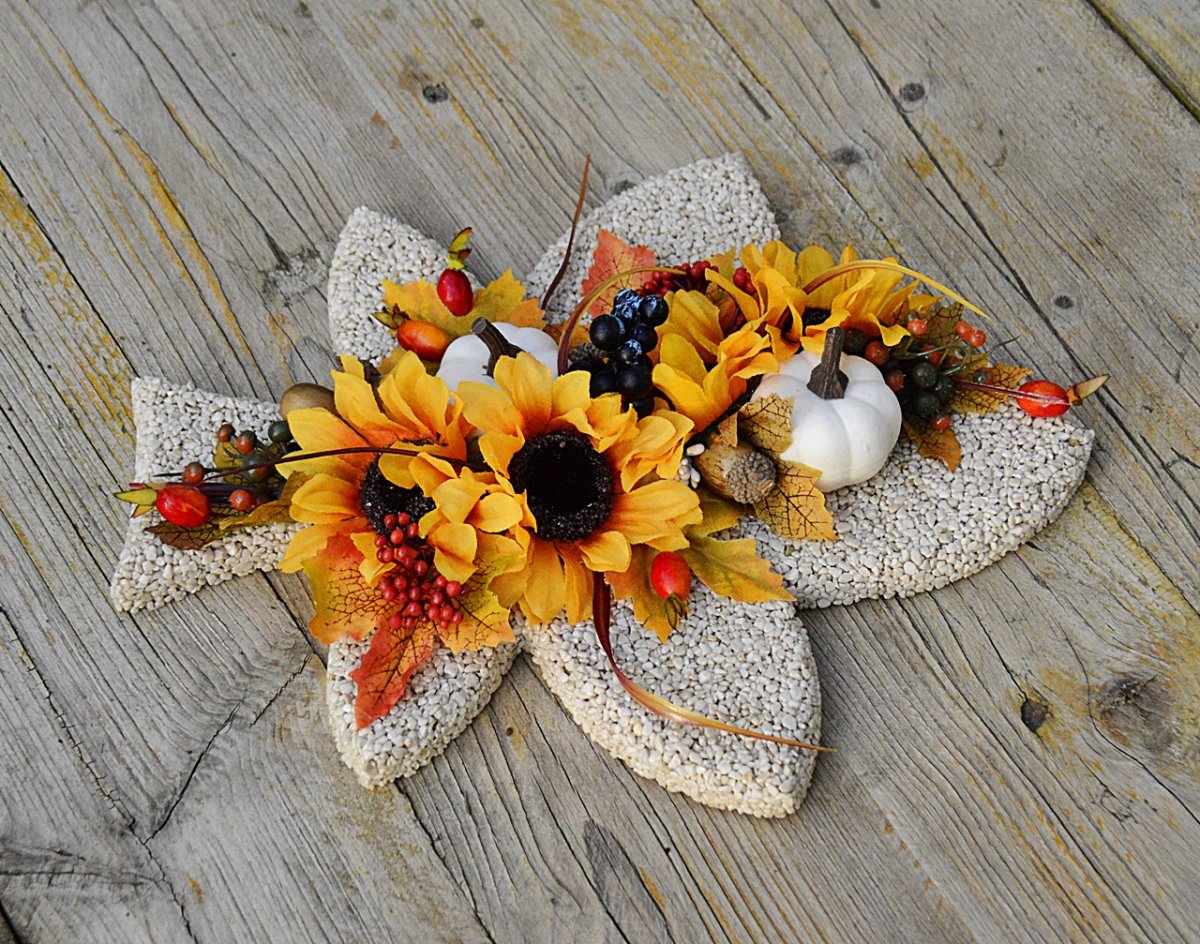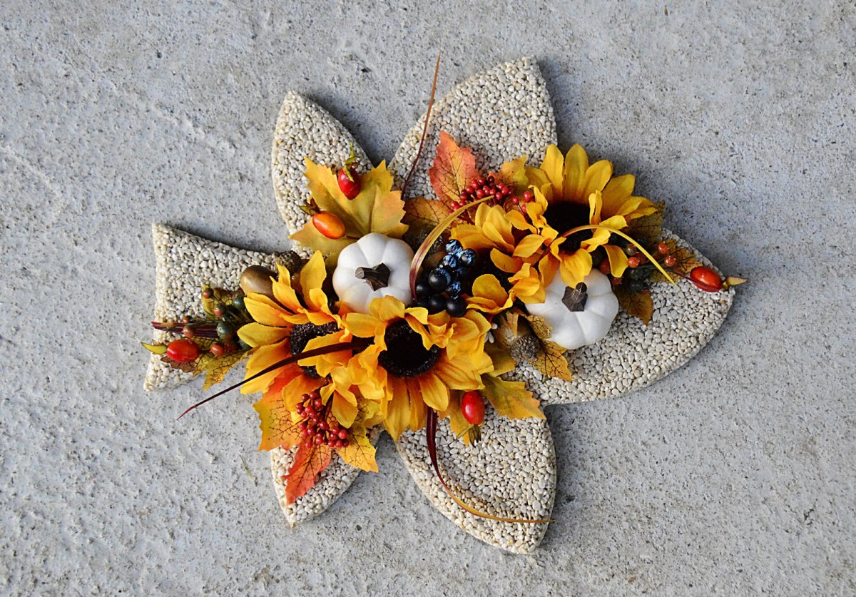 Podzimní dekorace na javorovém listu , který je vytvořen z kameniny a je těžší , takže jen tak neuetí :)), s umělými slunečnicemi, dýněmi a šípky.