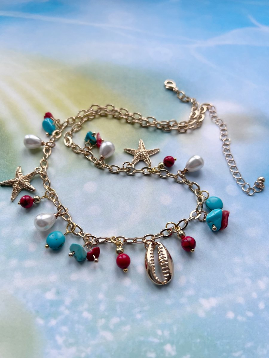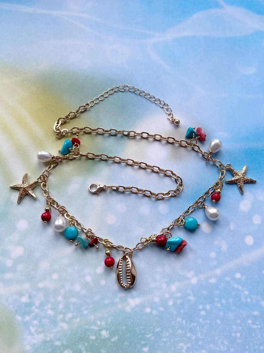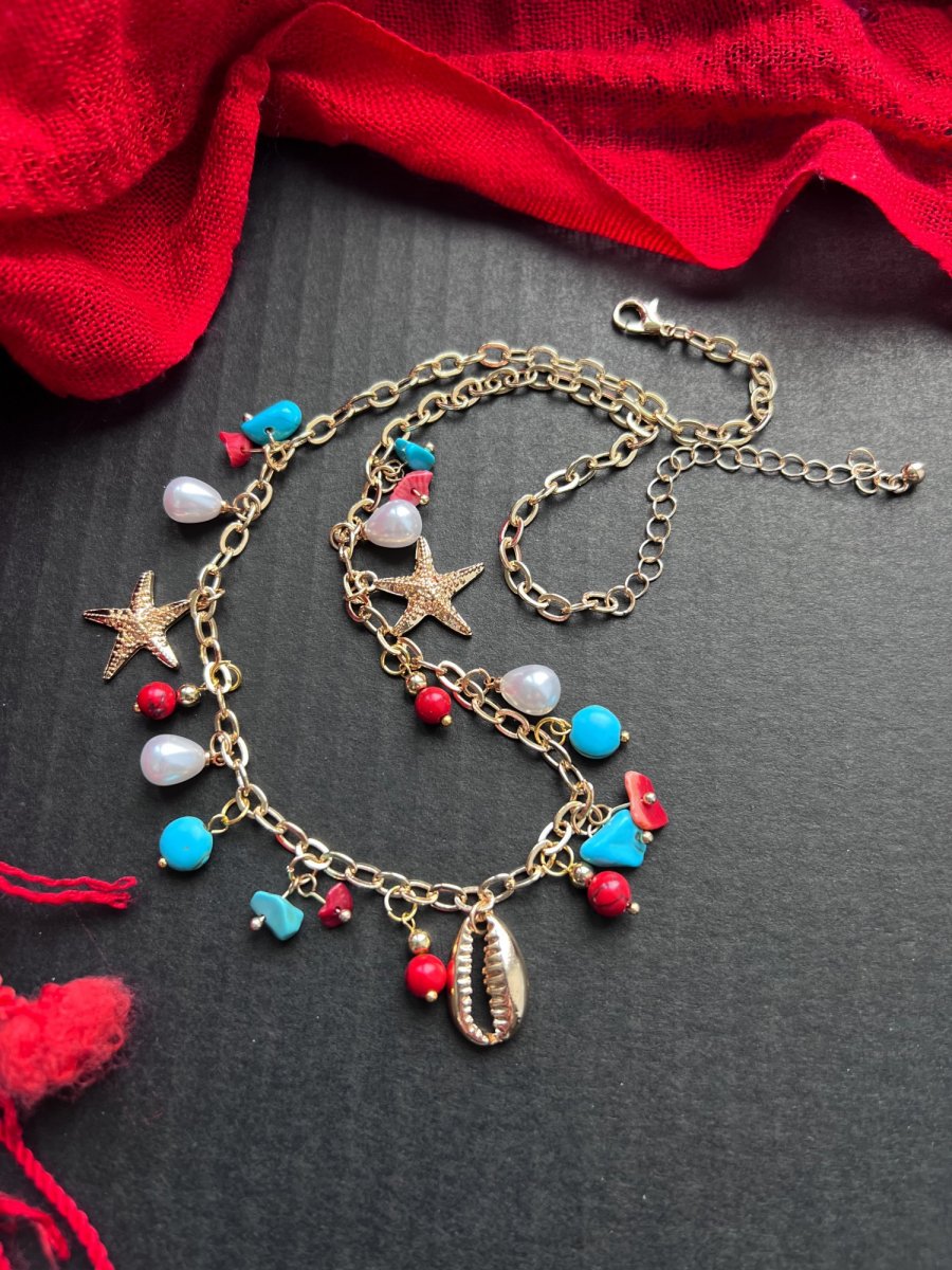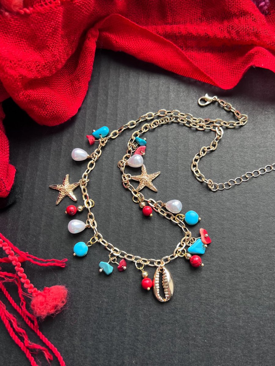 Zlatý přívěskový náhrdelník - perly, hvězdice, mušle, kamínky, tyrkenitky - přívěsky na hrubším zlatém řetízku (řetízek a kovové komponenty běžný kov). Délka 47 cm + prodlužující řetízek 8 cm, zapínání karabinka.
