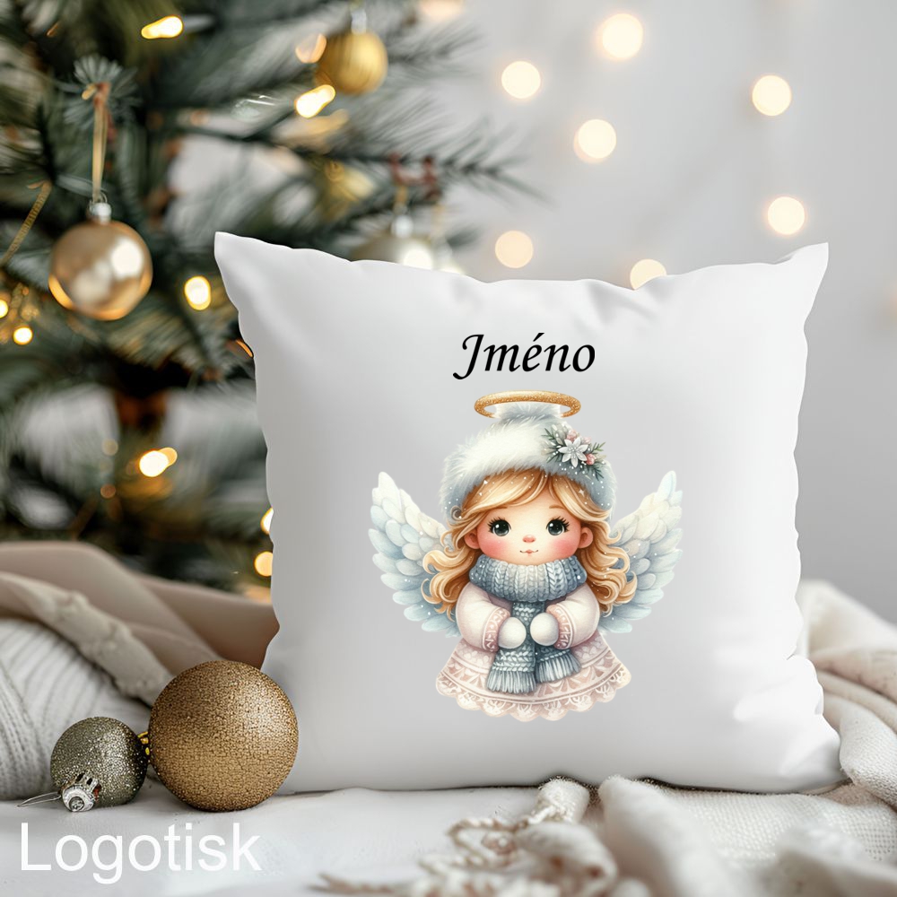 Polštářek potisk - grafika s vánočním potiskem s ANDÍLKEM - možnost umístění jména, nebo kratšího věnování nad motiv v ceně