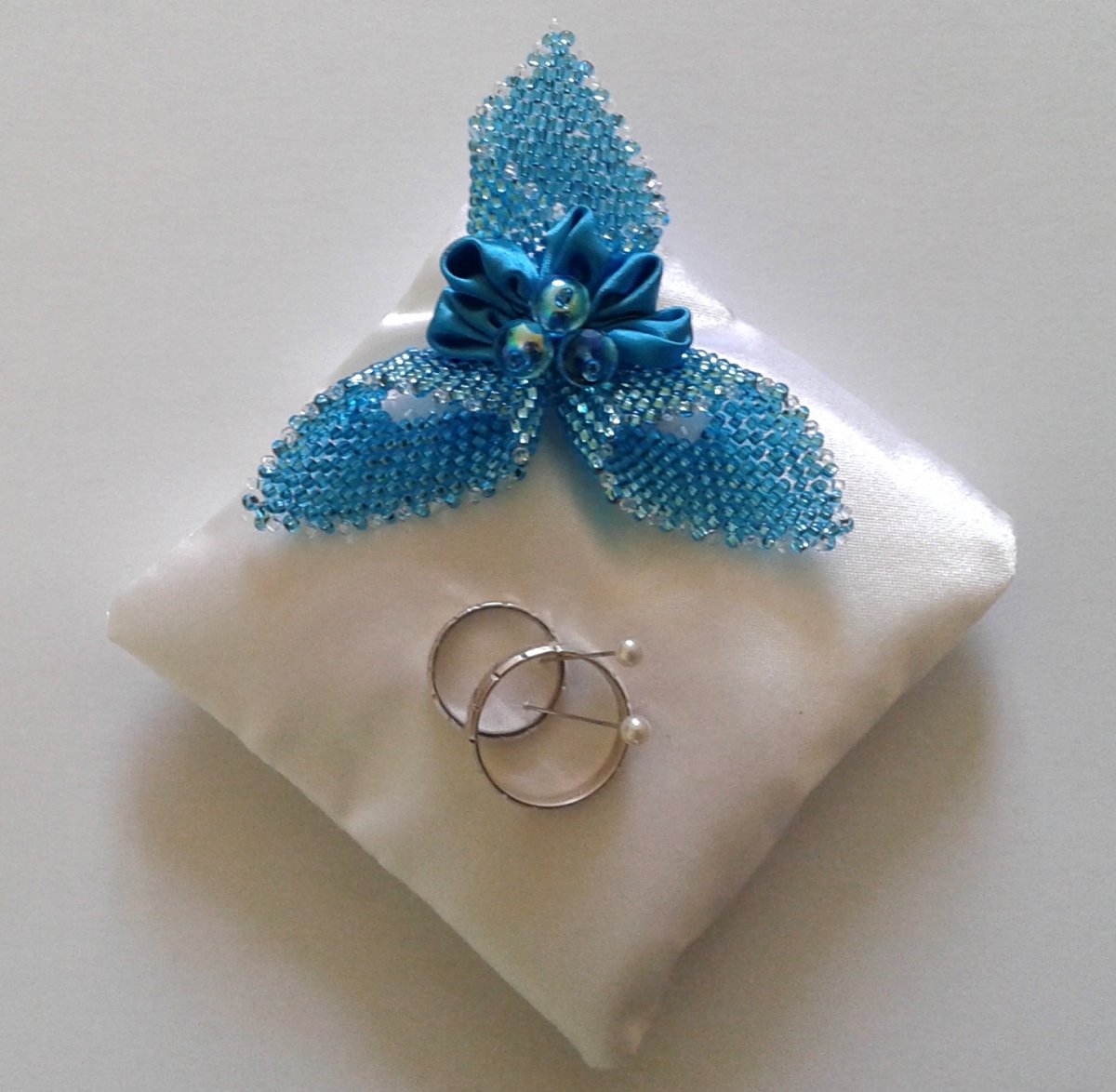 Bílý saténový polštářek pod snubní prstýnky ozdoben tyrkysovým korálkovým květem a tyrkysovým saténem. Velikost 10 x 10 cm. Součástí jsou i špendlíky s bílou hlavičkou.