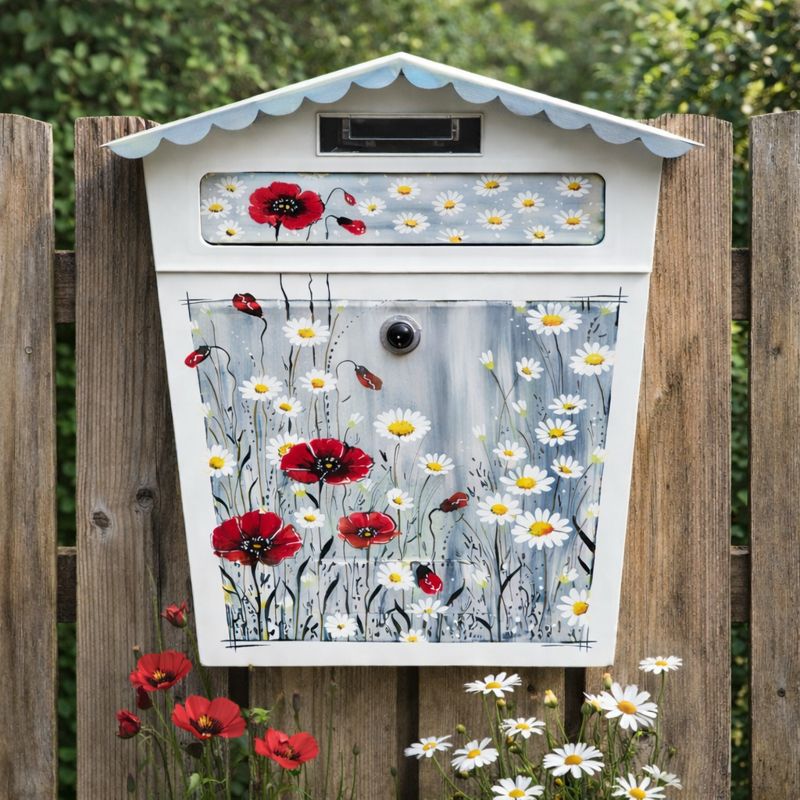 Originální ručně malovaná poštovní schránka s květinovým motivem červených máků a bílých kopretin promění vstup do domu v příjemné a osobité místo. Jemná kombinace šedých tónů, výrazných červených květů a bílých detailů působí svěže, romanticky a přirozeně zapadne do venkovního prostředí.