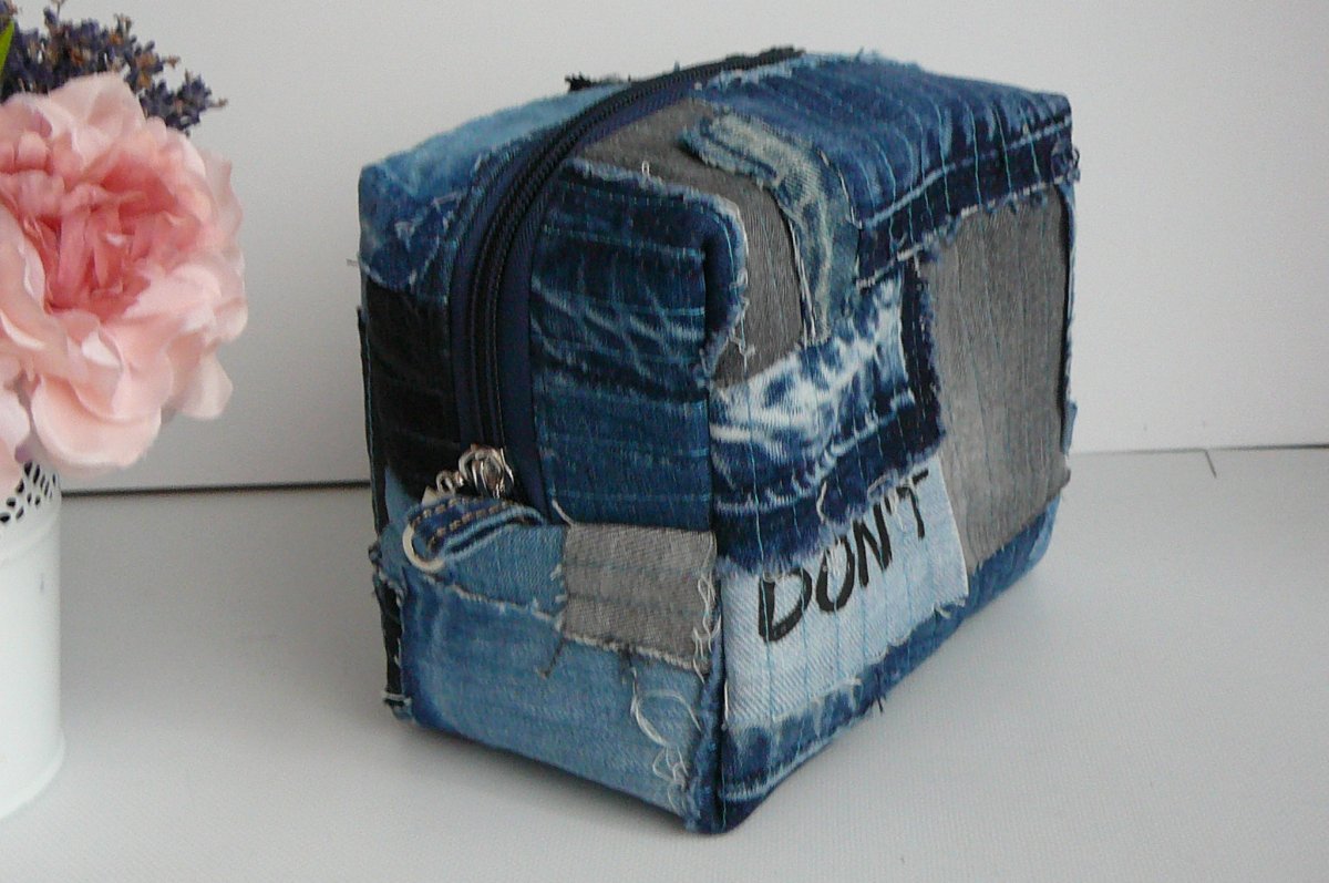 Originální pouzdro z recyklovaného denimu je víc než jen praktický doplněk – je to stylové vyjádření individuality. Každý patch, každé třepení a nápis 'DON'T' tvoří jedinečný design, který zaujme na první pohled. Ideální na drobnosti, kosmetiku nebo jako statement kousek do kabelky. Ručně šité s důrazem na detail a udržitelnost. Rozměr: šířka 14 cm, výška12 cm, hlobka 9 cm.