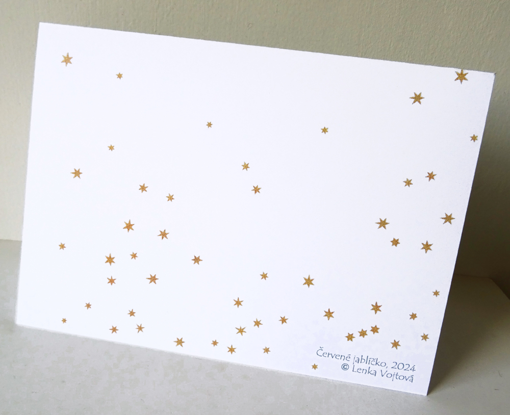 Tištěno na papír s gramáží 300gm2. Rozměr 12 x 16,5 cm, dvojitá, otevírací karta, uvnitř čistá. Dodáváno s obálkou.