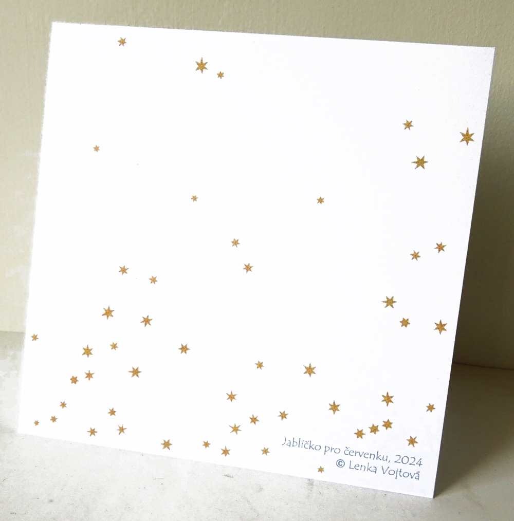 Tištěno na papír s gramáží 300gm2. Rozměr 13 x 13 cm, dvojitá, otevírací karta, uvnitř čistá. Dodáváno s obálkou.