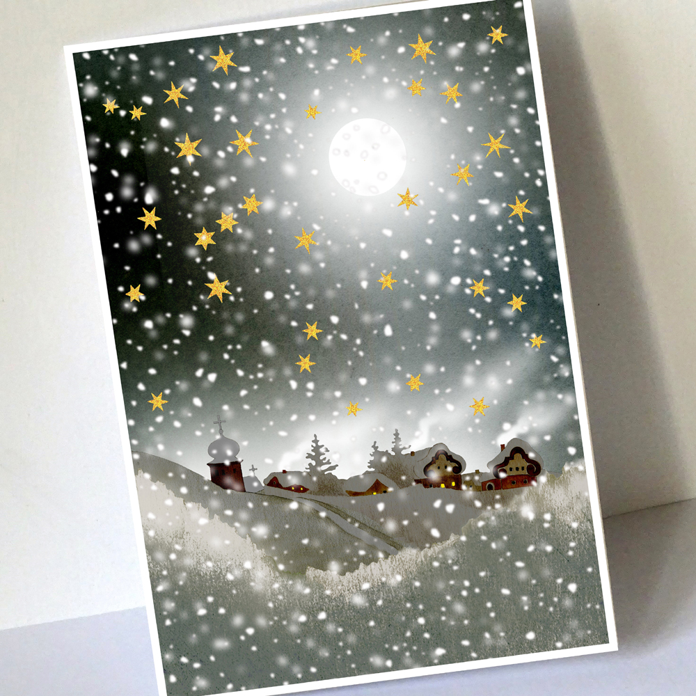 Vánoční přání s vlastním autorským motivem. Technika akvarelu s pastelem.
