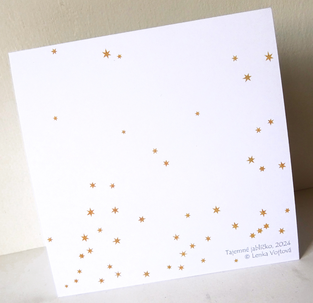 Tištěno na papír s gramáží 300gm2. Rozměr 13 x 13 cm, dvojitá, otevírací karta, uvnitř čistá. Dodáváno s obálkou.