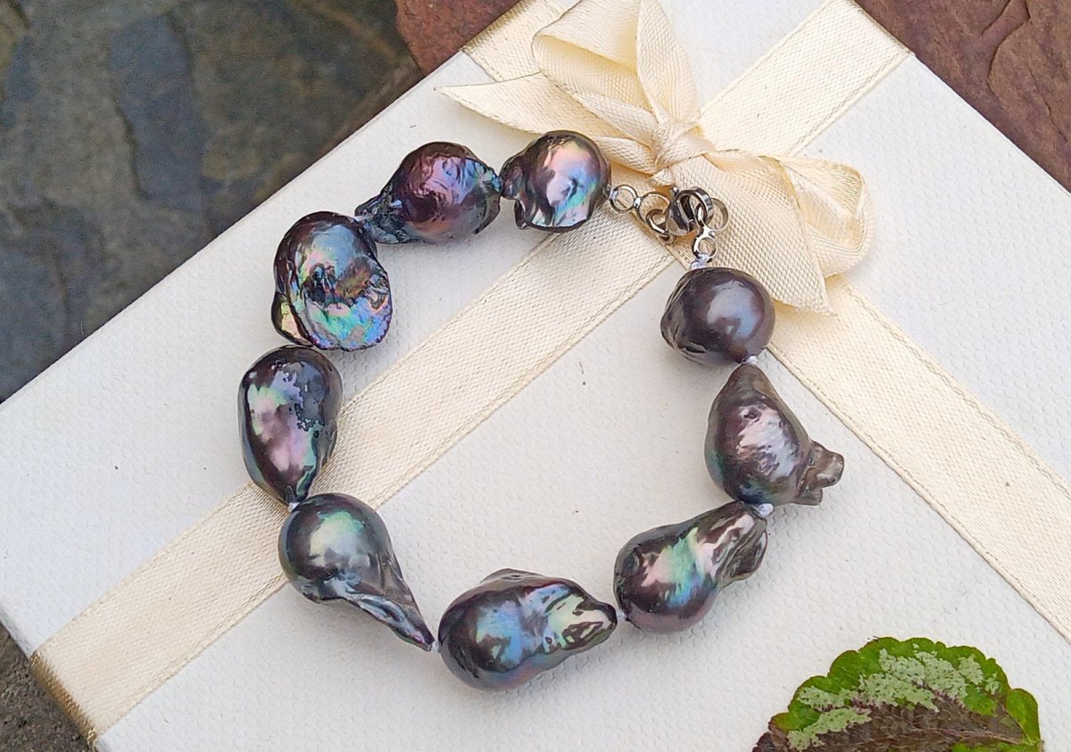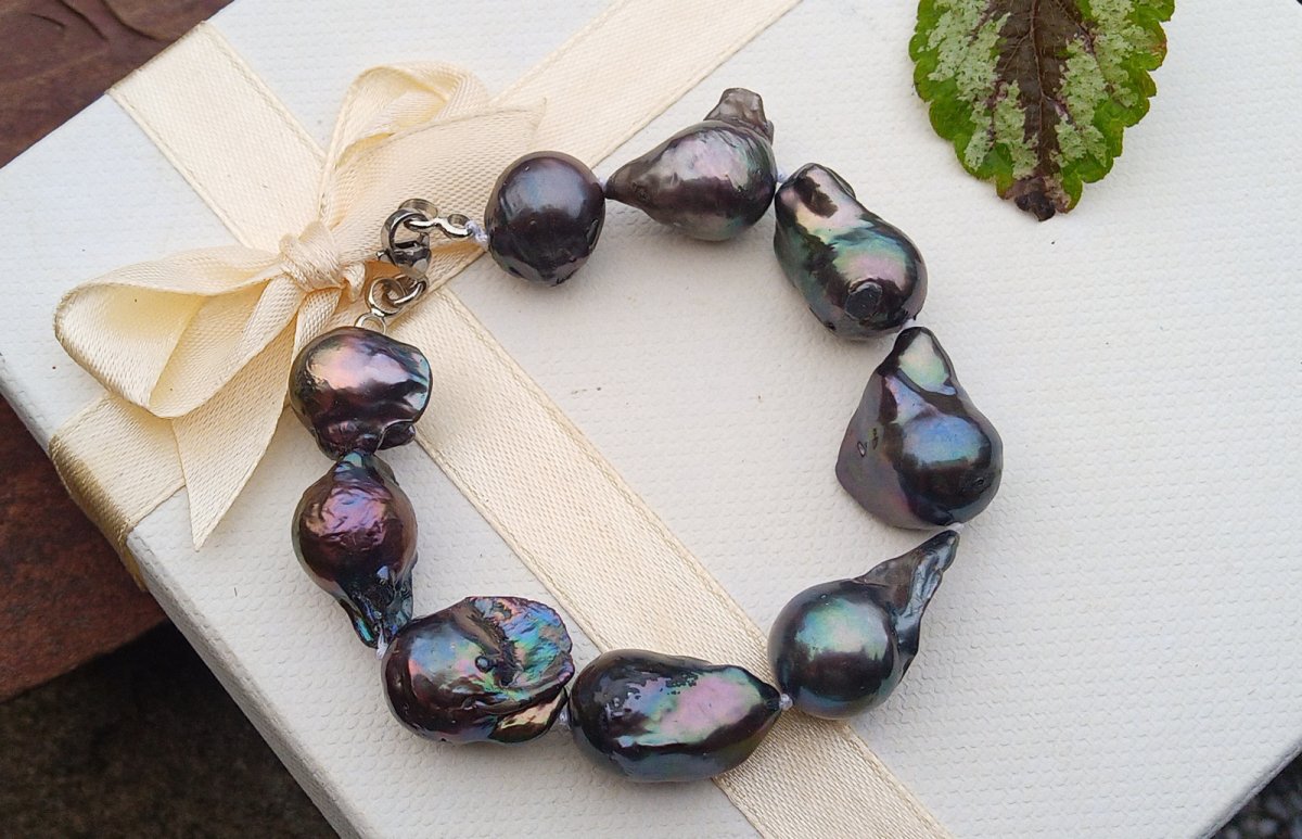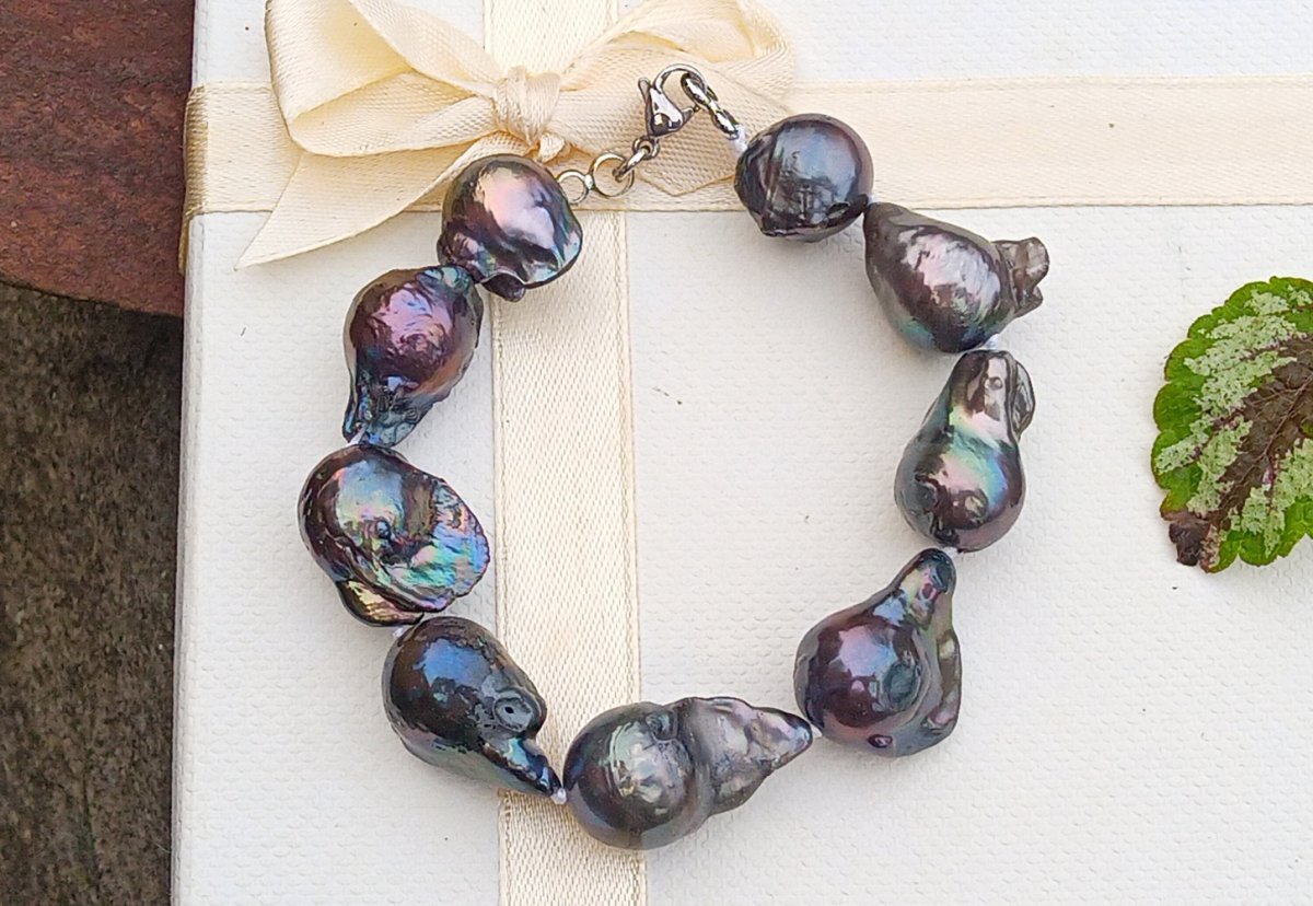 Barokní tahitské mořské tmavé perly o velikosti cca 15-25 mm, s vysokým leskem a s nádhernými duhovými perleťovými odlesky se zapínáním na karabinku z chirurgické oceli - hypoalergenní. Jednotlivé perly jsou od sebe oddělené uzlíky proti vzájemnému odírání a pro lepší ohebnost náramku.