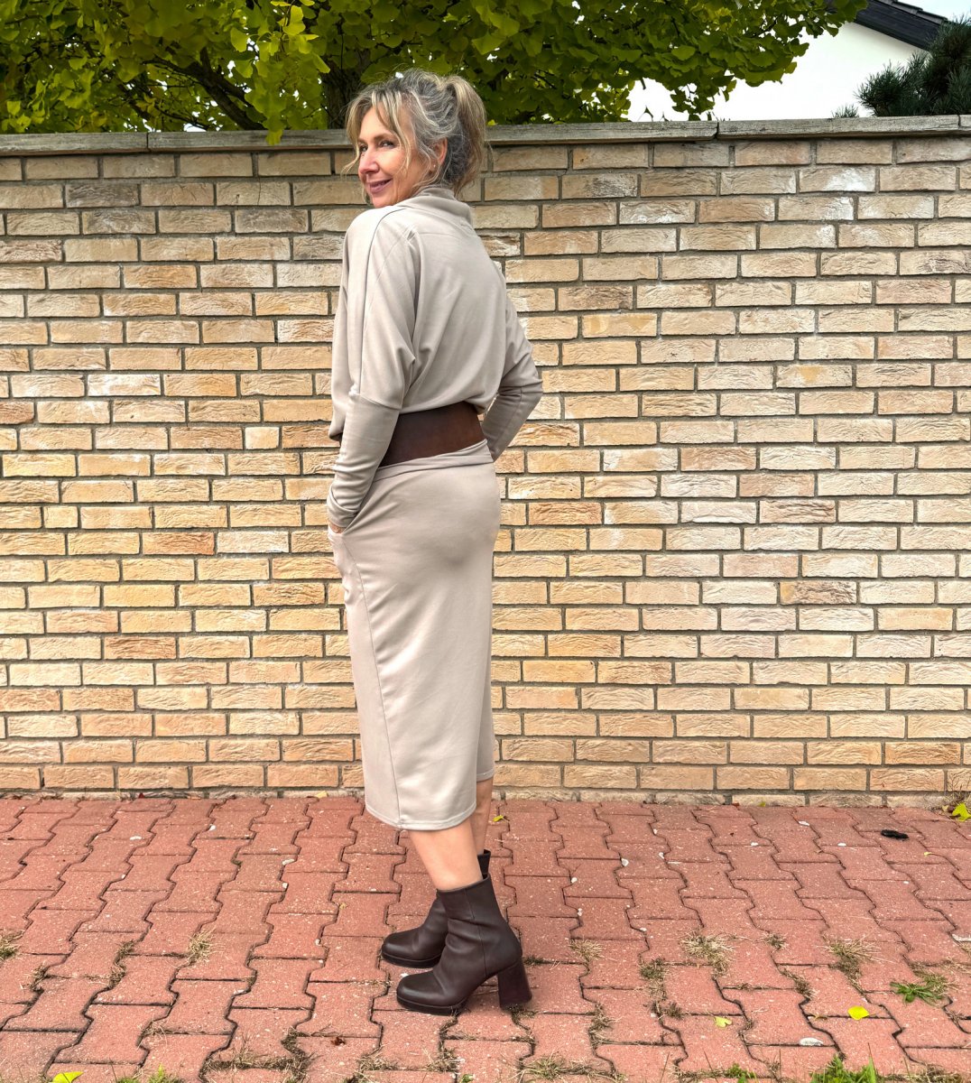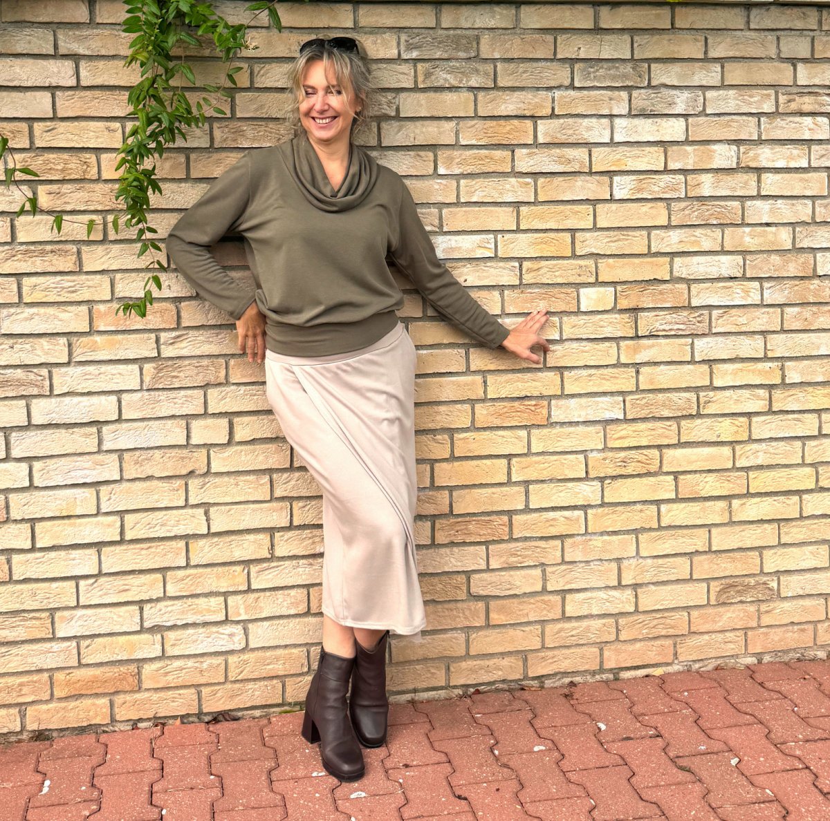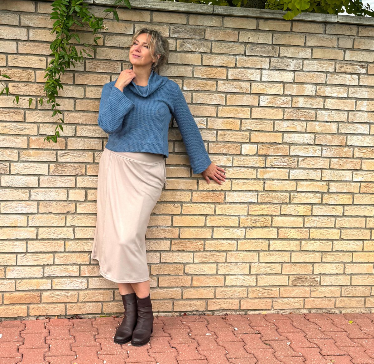 Sukně je ušitá ze směsového středně silného úpletu (68%Vis/28pes/4%ela). Pásek je pružný (vyztužený proti vytažení). Sukně je falešně zavinovací. v bocích jsou vnitřní kapsy.