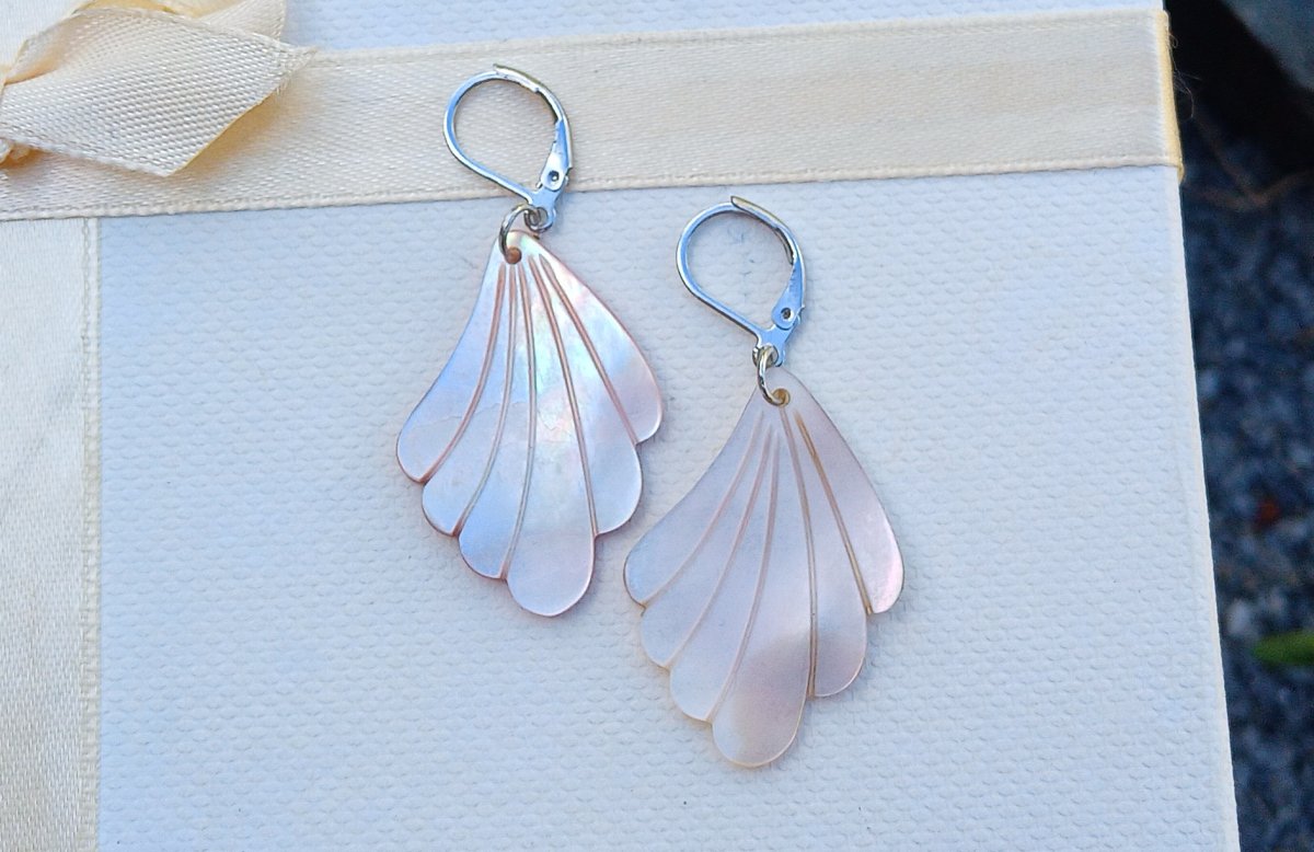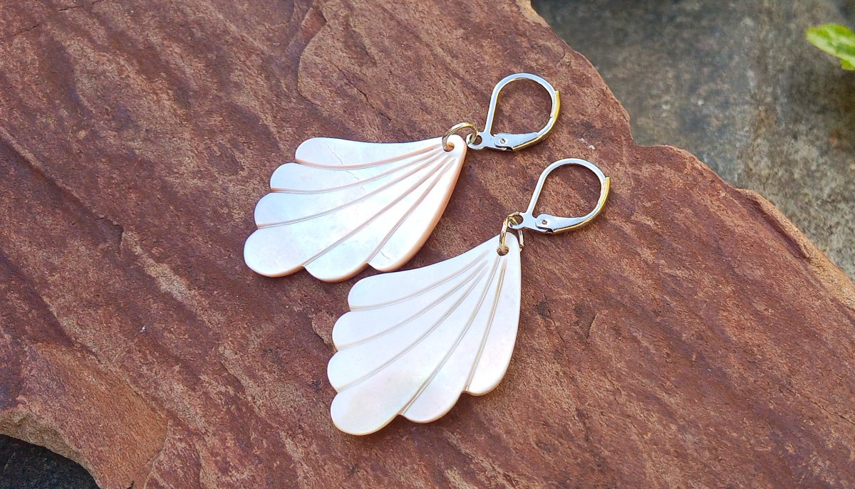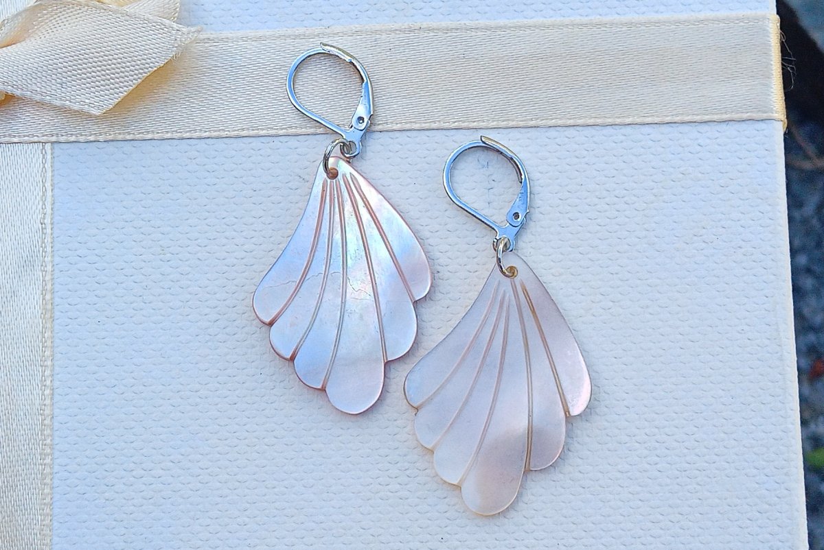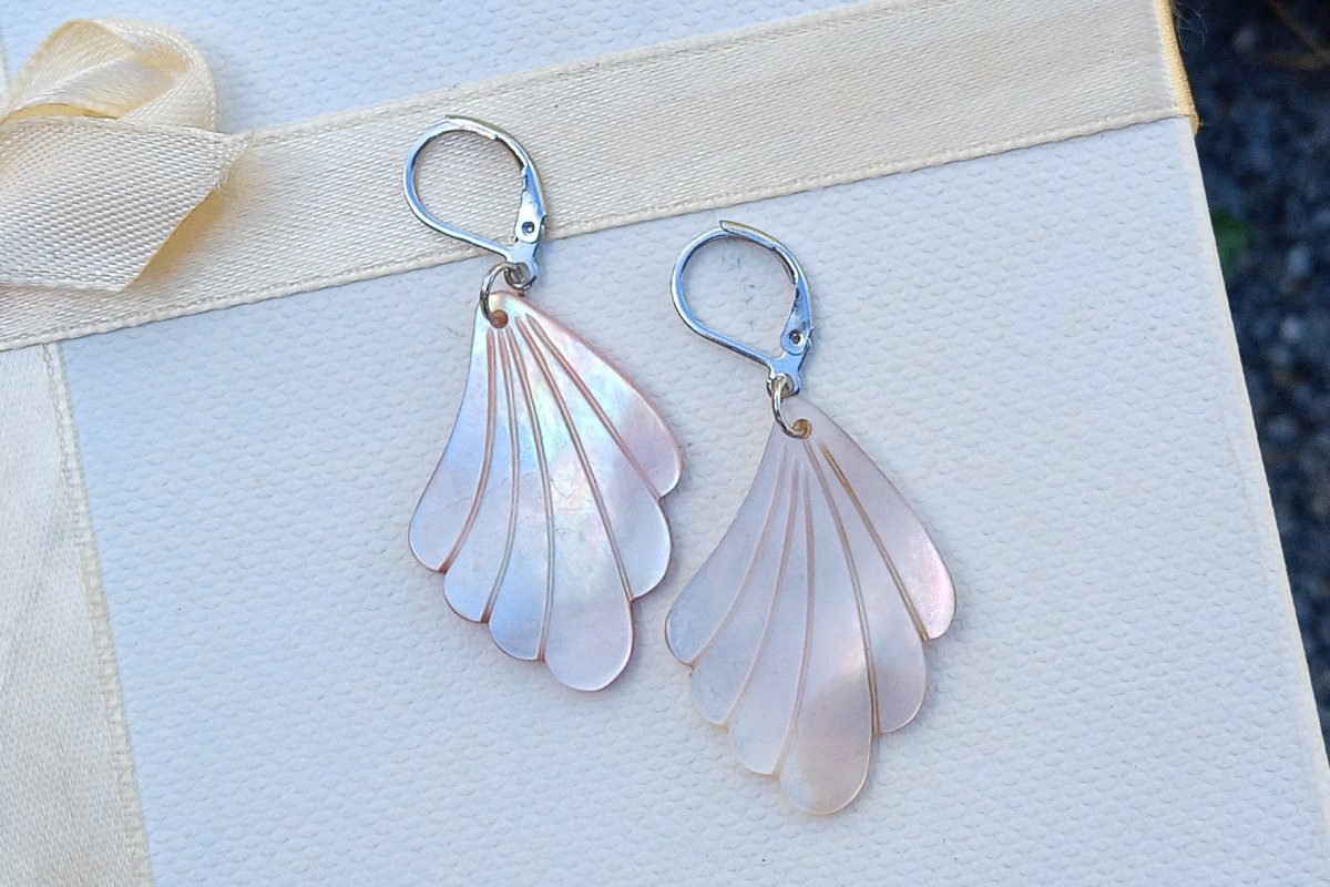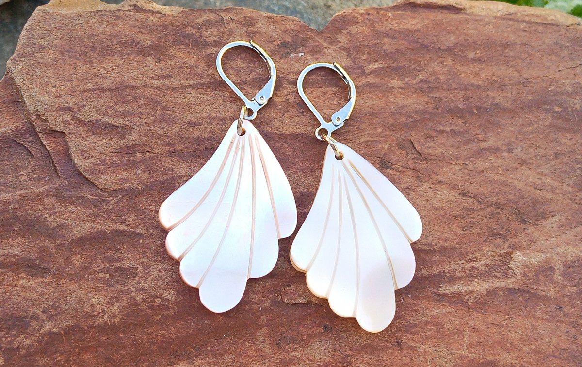 Přírodní vyřezávaná perleť 3,5x2,5 cm s úžasnými duhovými perleťovými odlesky na zavíracích háčcích z chirurgické oceli - hypoalergenní, vhodné i pro alergiky.