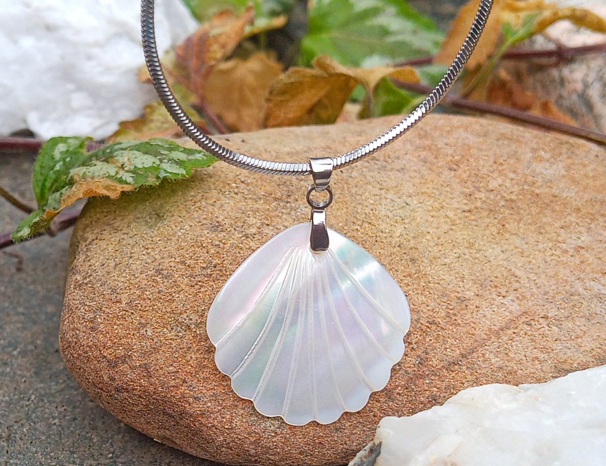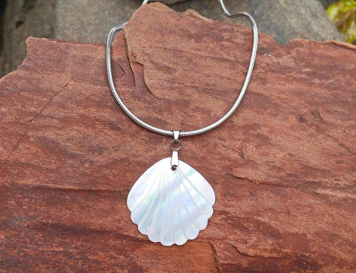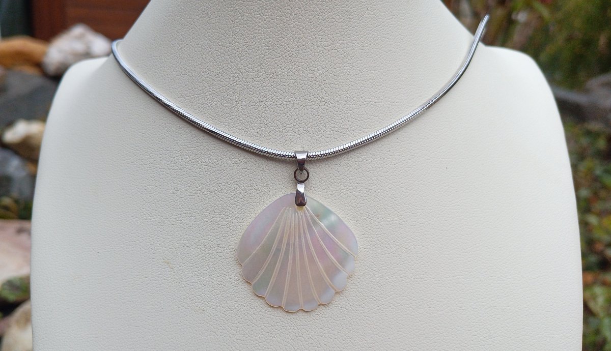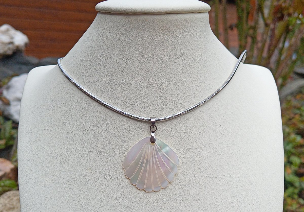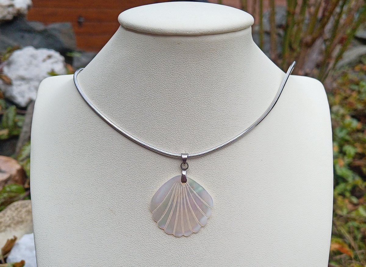 Přírodní vyřezávaná perleť 28x28 mm s úžasnými duhovými perleťovými odlesky zavěšená na hadovitém z chirurgické oceli - hypoalergenní, vhodné i pro alergiky.
