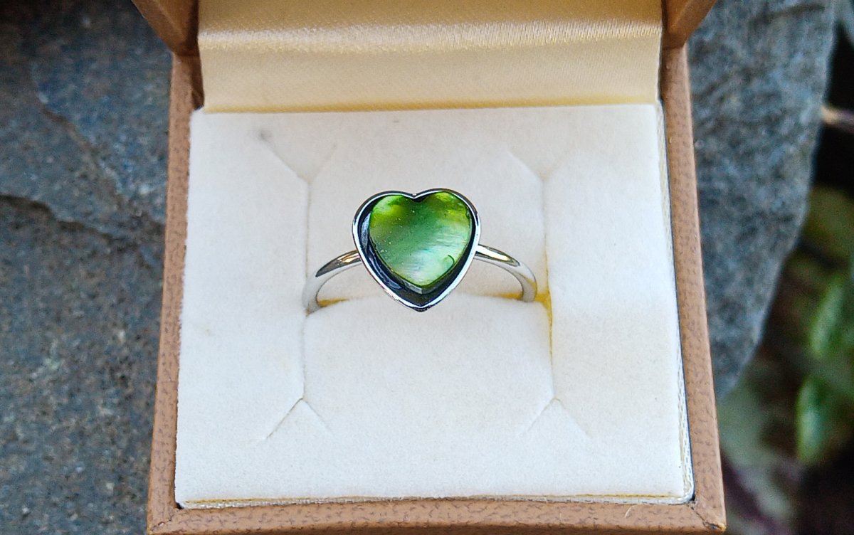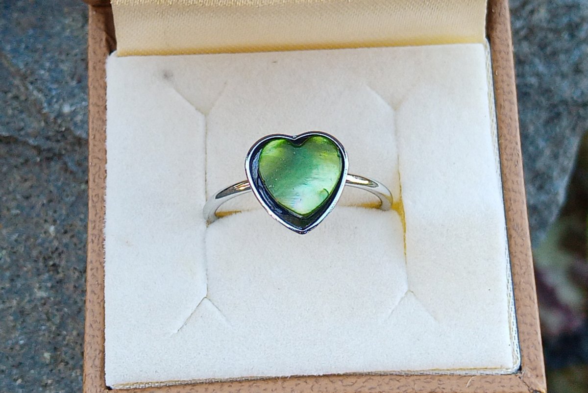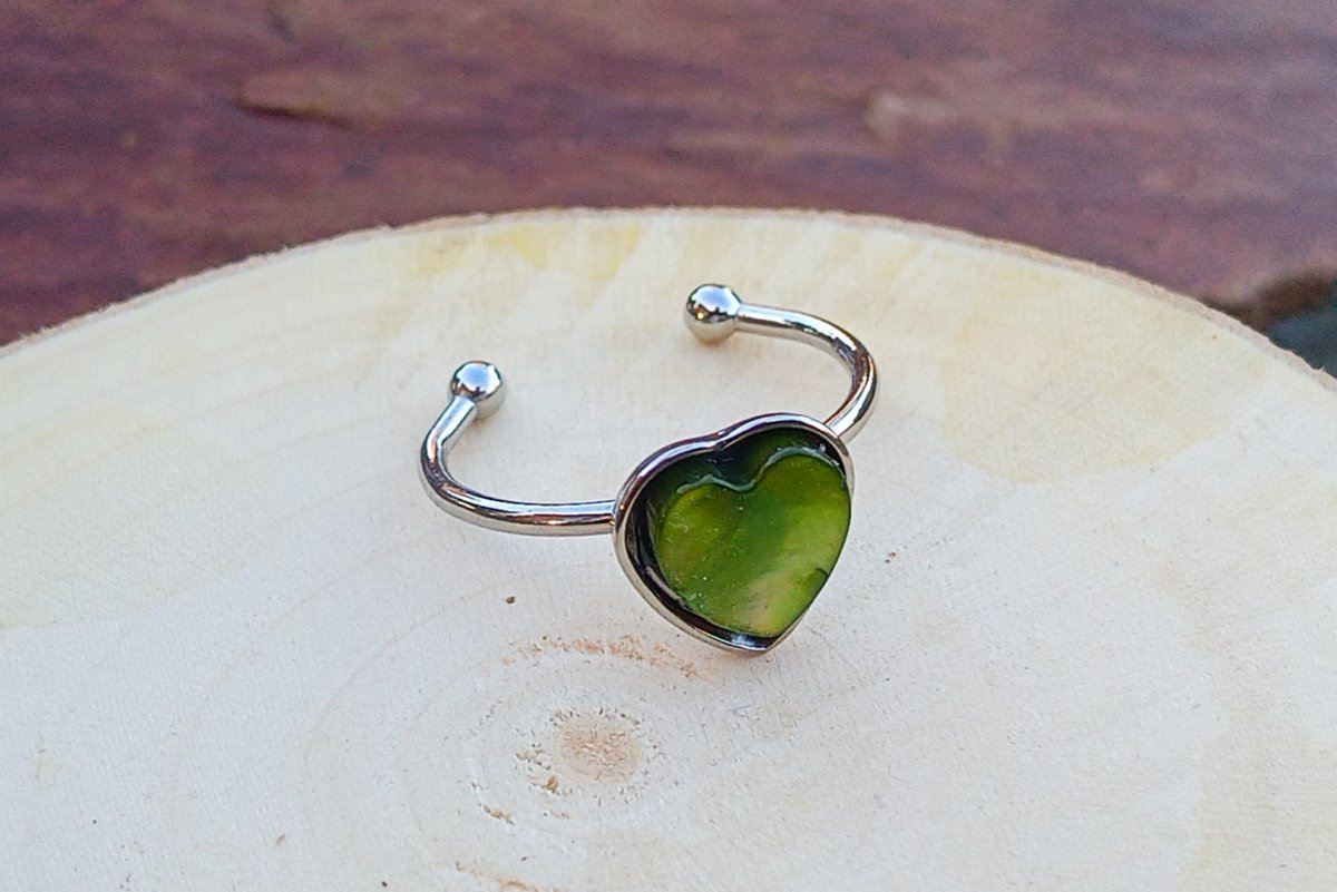 Srdíčko z přírodní dokonale lesklé zelené duhové perletě ❤️ vložené do kroužku v univerzální velikosti z chirurgické oceli, což je hypoalergenní kov - vhodný i pro alergiky.