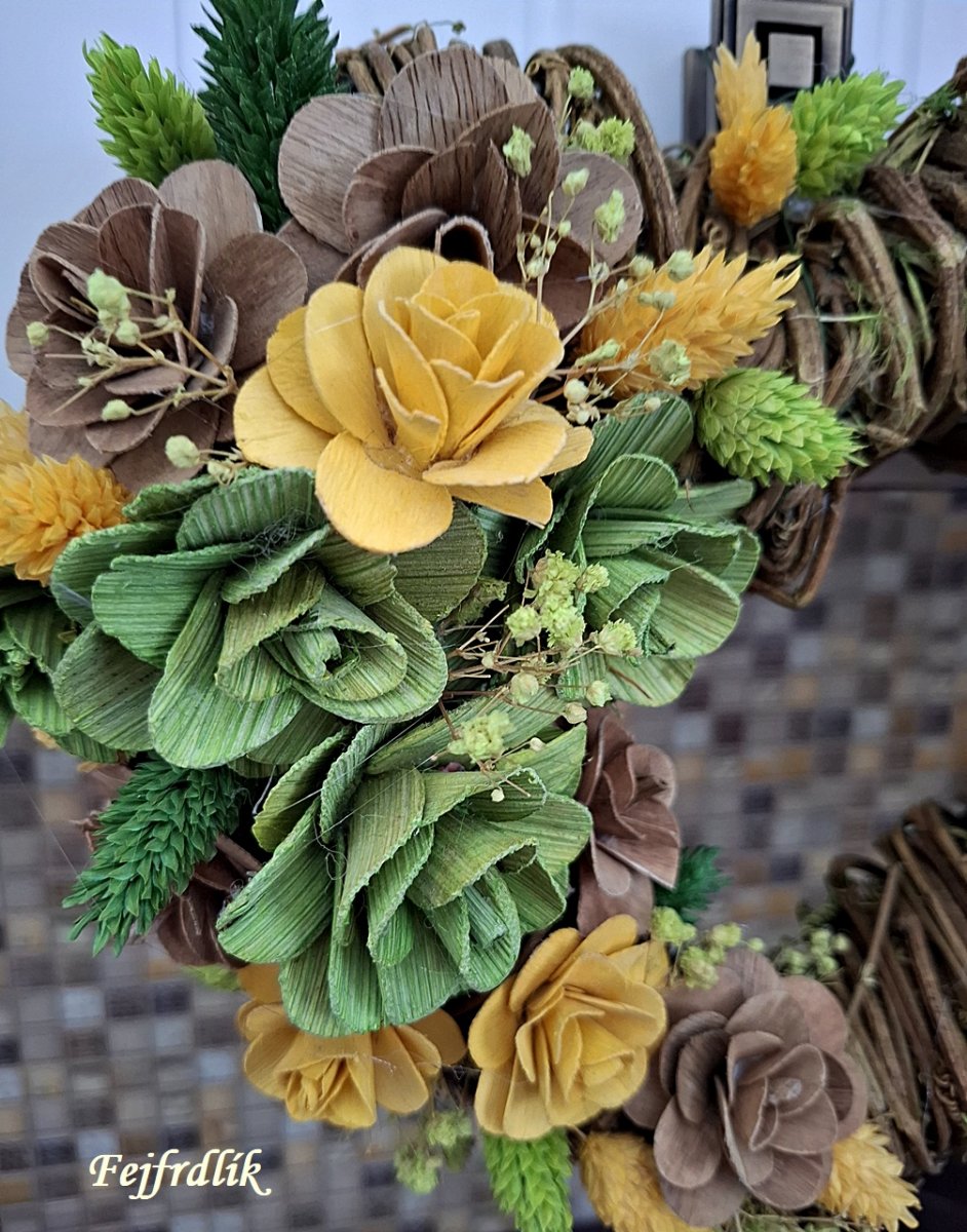 Přírodní srdíčko s dřevěnými růžičkami a sušinou.