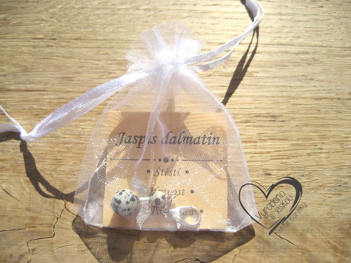 Andělský přívěsek - anděl - andílek - andělíček pro štěstí z minerálu jaspis dalmatin a kovových komponentů, v dárkovém balení s kartičkou - přívěsek na klíče - peněženku nebo jen tak pro radost, velikost přívěsku 4,5cm vč.karabinky