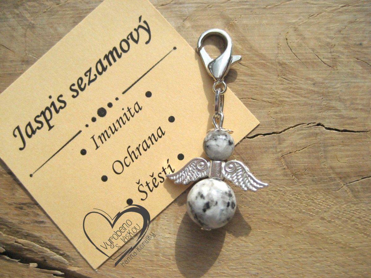 Andělský přívěsek - anděl - andílek - andělíček pro štěstí z minerálu jaspis sezamový a kovových komponentů, v dárkovém balení s kartičkou - přívěsek na klíče - peněženku nebo jen tak pro radost, velikost přívěsku 4,5cm vč.karabinky