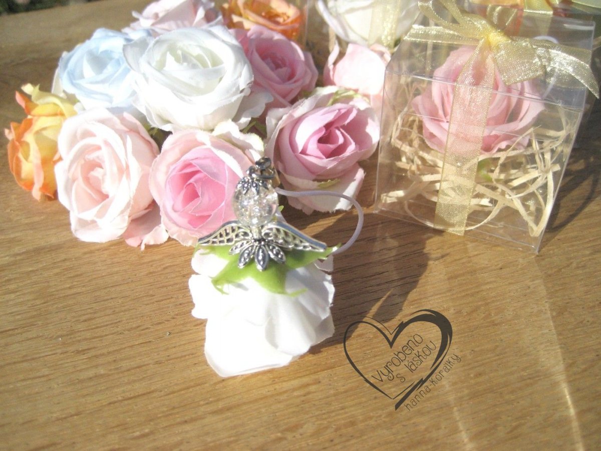 Andělský rozkvetlý přívěsek - anděl - andílek - andělíček růžička pro štěstí, pro radost i pro krásu v dárkovém balení, velikost cca 5 cm + šňůrka, barva - bílá, cena za kus.