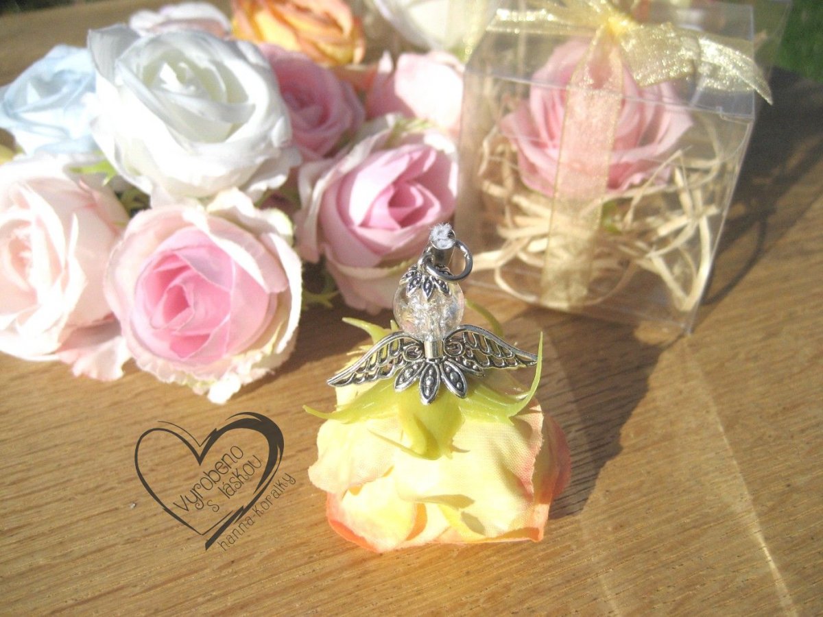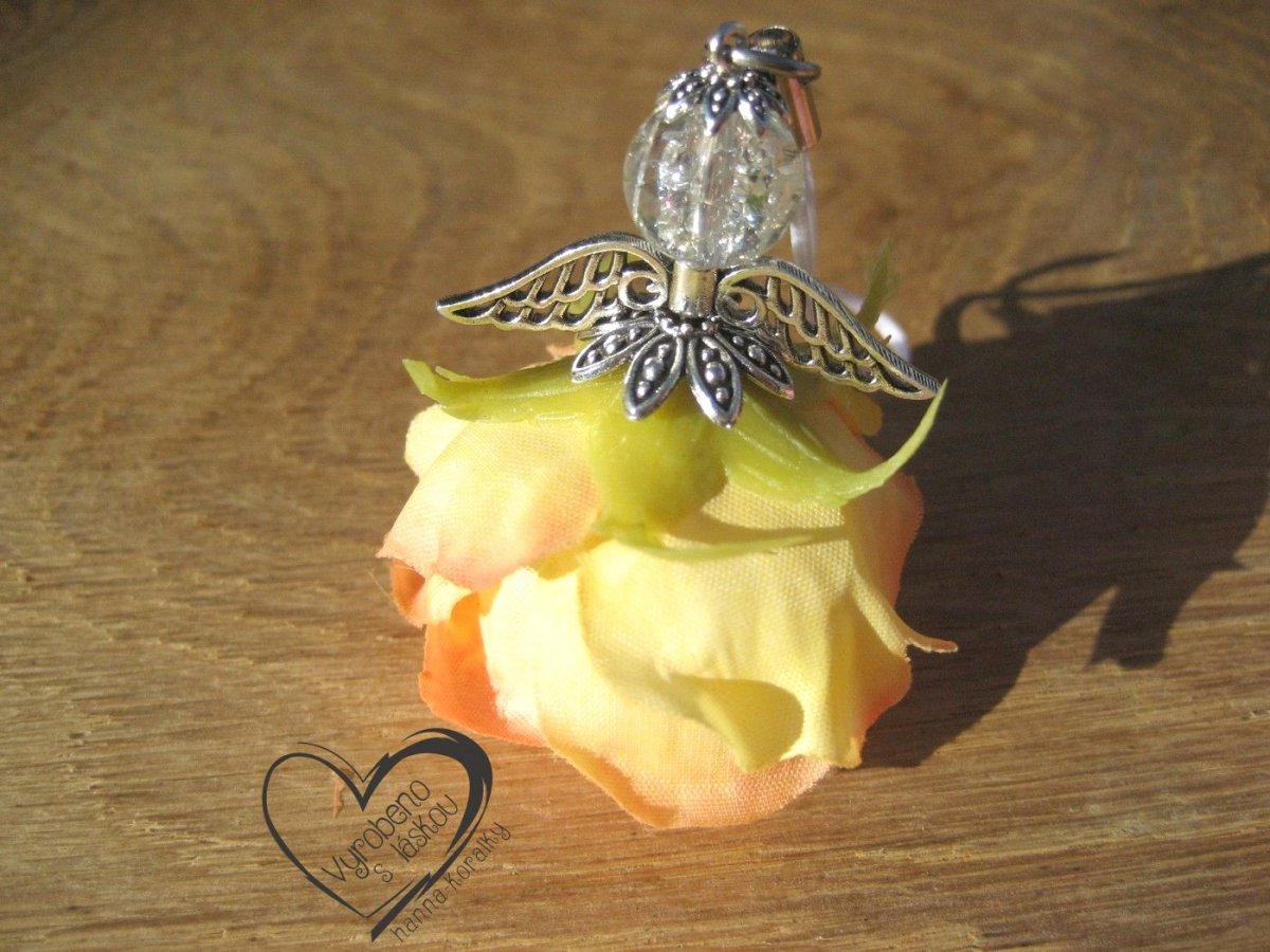 Andělský rozkvetlý přívěsek - anděl - andílek - andělíček růžička pro štěstí, pro radost i pro krásu v dárkovém balení, velikost cca 5 cm + šňůrka, barva - žlutá, cena za kus.