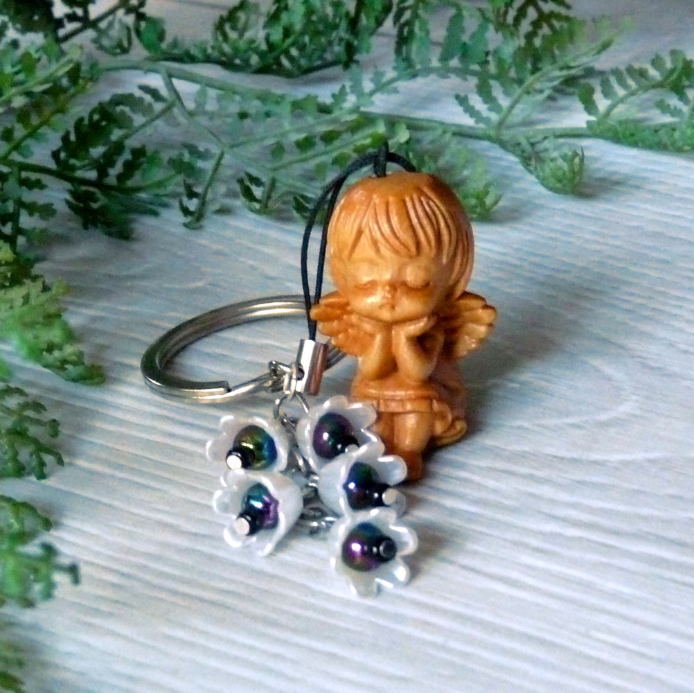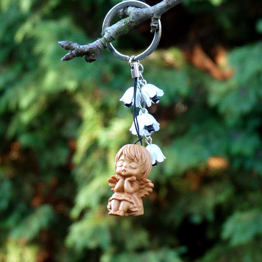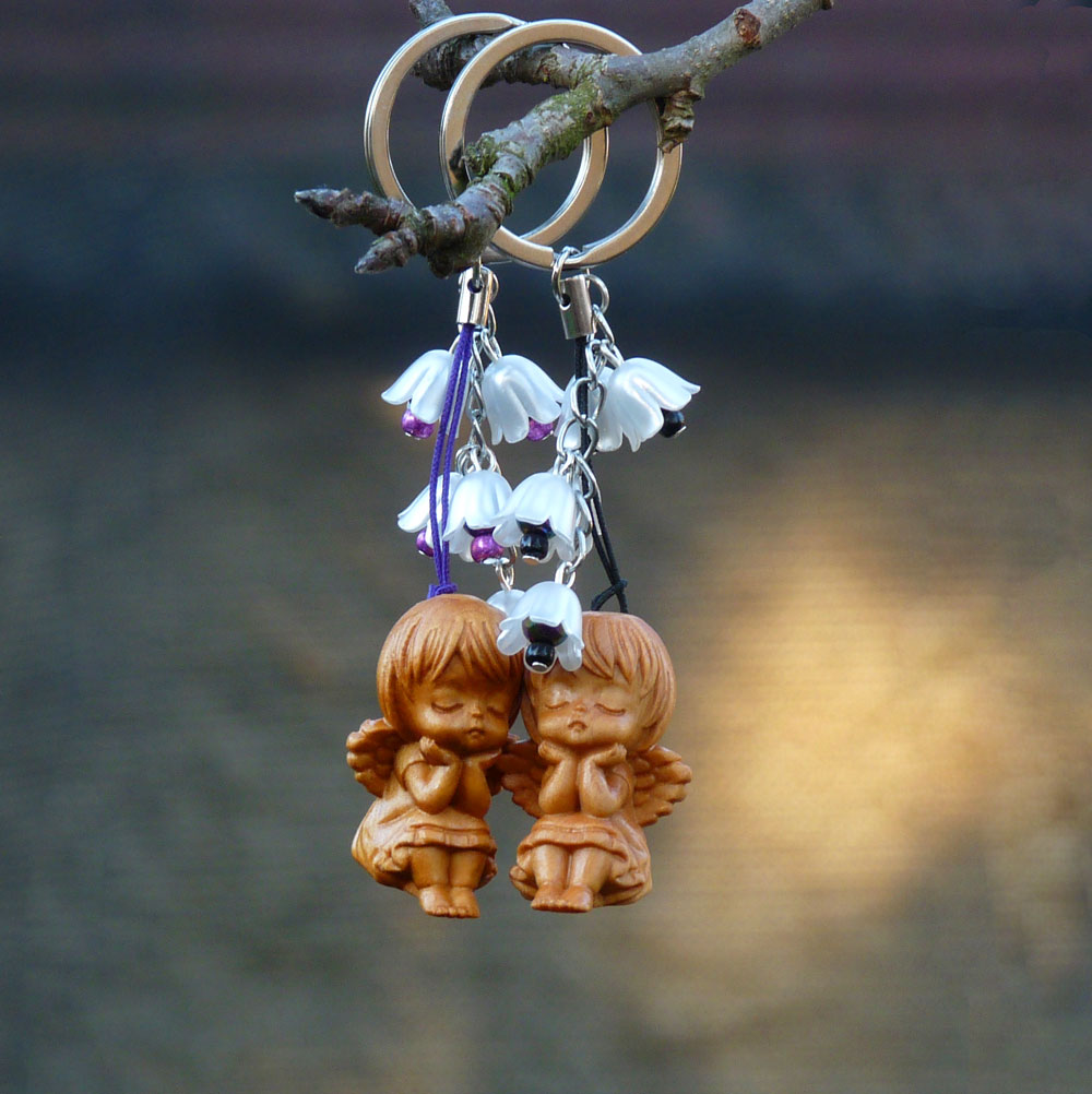 V nabídce ještě další dřevěné zvířátkové klíčenky a malý andílek se zvonky s fialovým středem