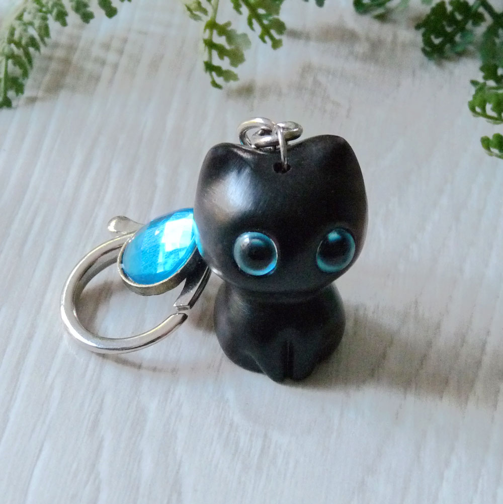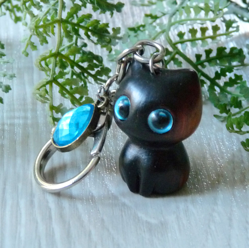 Kočička je připevněná na krátký řetízek ozdobený velkou modrou slzou, která podtrhuje modré oči kočičky