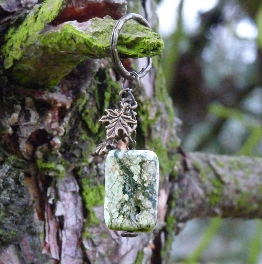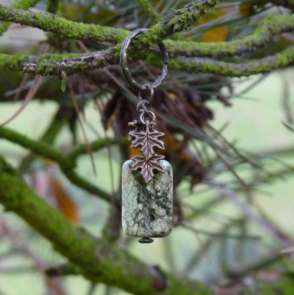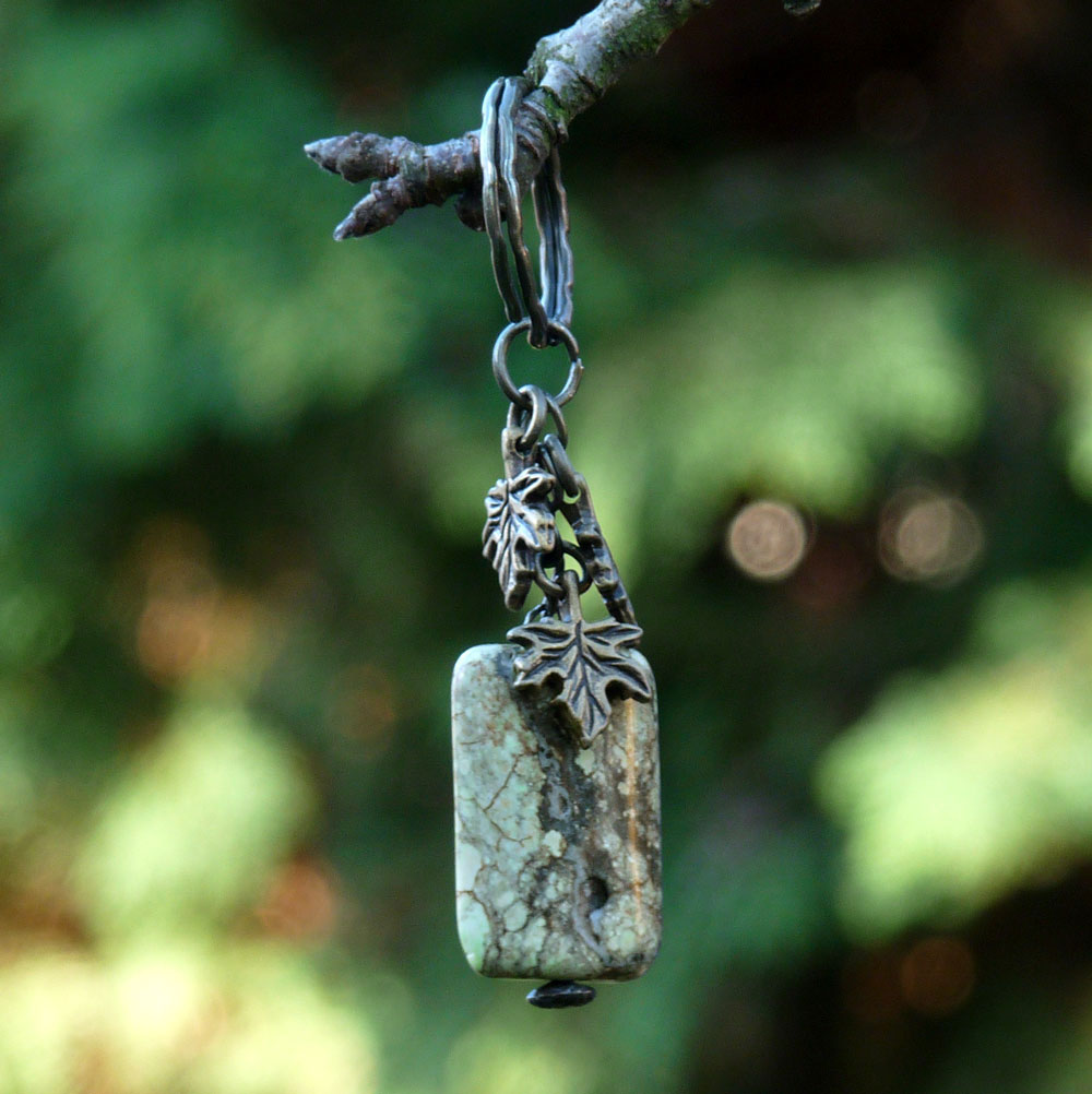Ohlazený obdélníkový ryolit je připevněný na krátký řetízek ozdobený kovovými listy