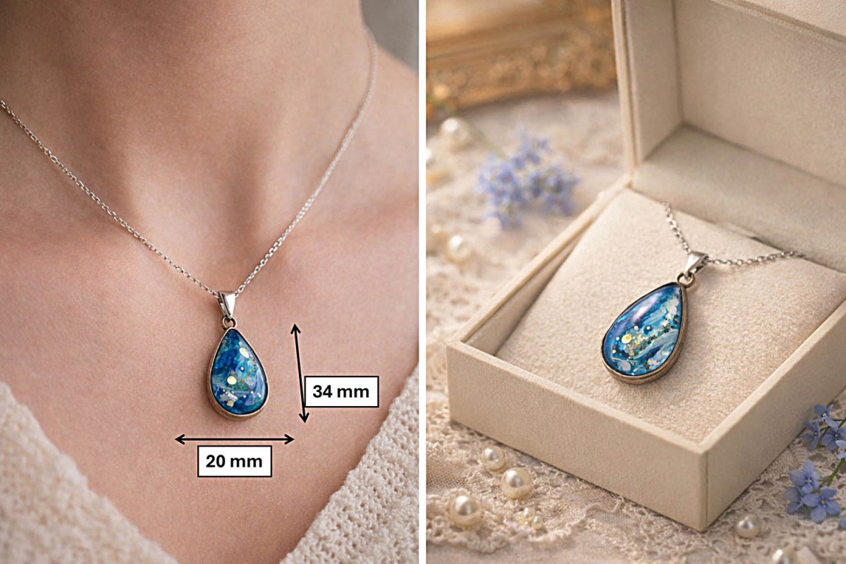 Díky průhlednosti pryskyřice vzniká zajímavý efekt hloubky. Šperk se mění podle světla a pohybu – jemně se třpytí a přitahuje pohledy.