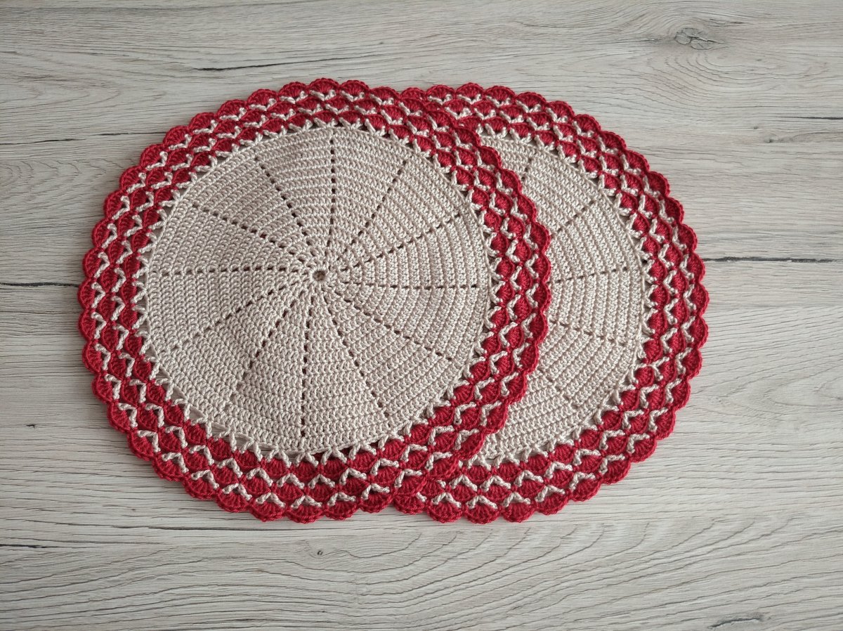 Háčkované prostírání nebo podložky pod květiny, ozdoby, vázy či cokoliv. Béžová s korálově červenou jsou krásná kombinace. Působí i vánočně.