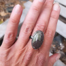 Výrazný cínovaný prsten, jehož základem je kabošon prehnitu o velikosti 25 x 15 x 7 mm (Afrika). Prehnit je tradiční talisman pro duševní a duchovní problémy, tlumí strach, úzkost a pochybnosti, které mohou člověka doslova ochromit a život učinit komplikovaný.
