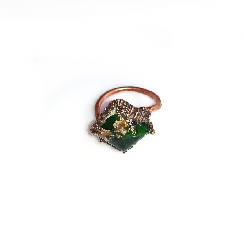 Tento šperk vznikl spojením přírody a alchymie. Starodávné kameny a moderní technologie. Šperk vzniká pomalu, vrstva po vrstvě, v procesu trvajícím několik dní. Nesmí se uspěchat. Měď se usazuje jako krystalizující energie – tichá, přesná, magická. Výsledkem je jedinečný artefakt – pevný, a přitom nese křehkost a jemnost původního materiálu.