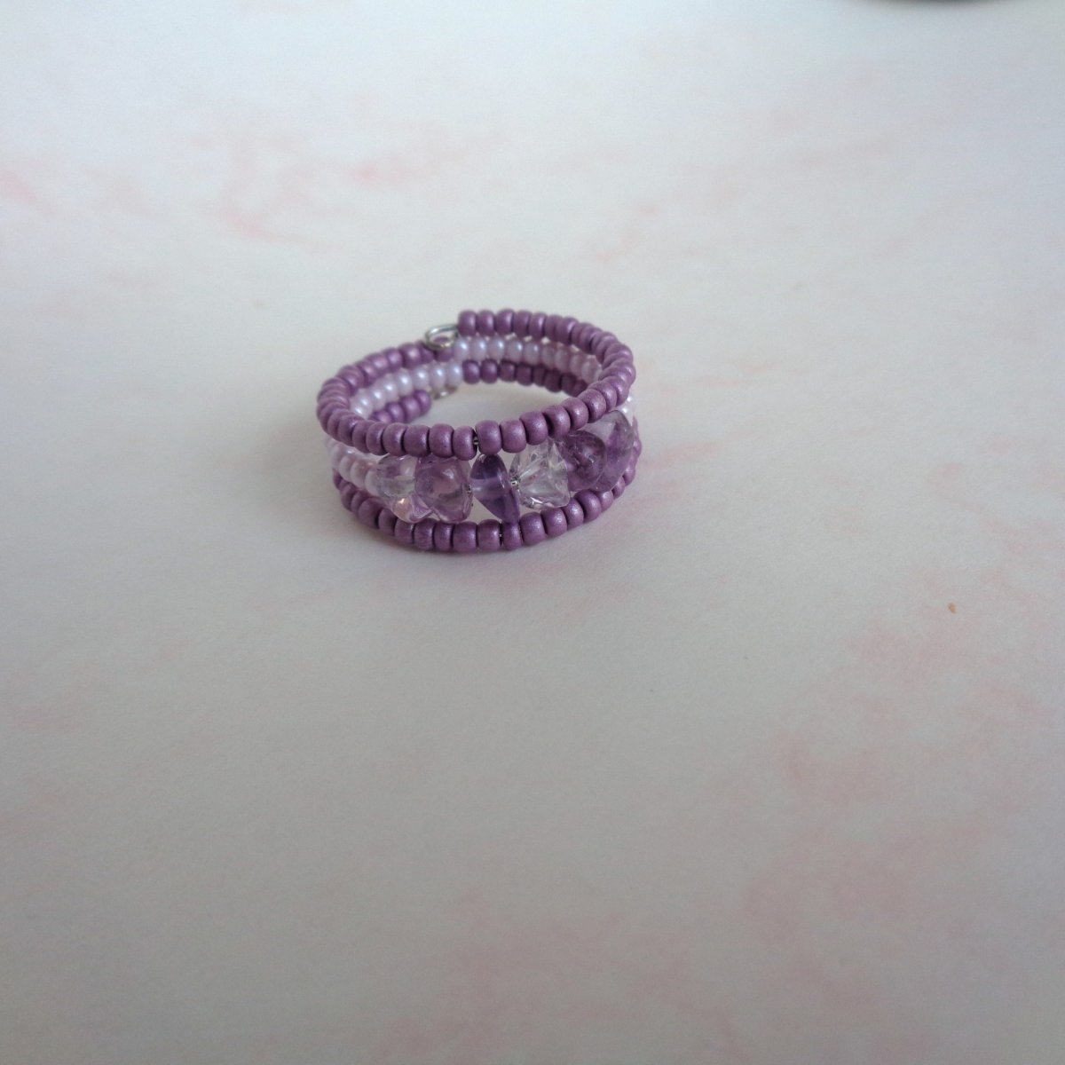 Prstýnek z rokajlu fialové a levandulové barvy a minerálu - ametyst. Vše na třech otočkách paměťového drátku.