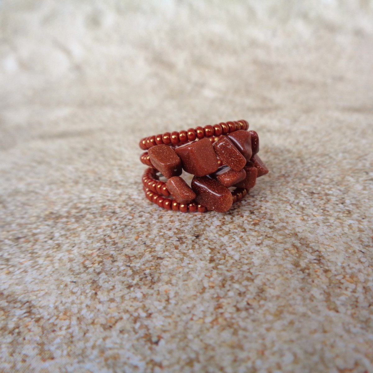 Prstýnek z rokajlu rezavé (měděné) barvy a minerálu - avanturín. Vše na čtyřech otočkách paměťového drátku.