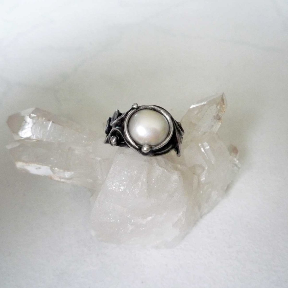Autorský prstýnek zhotoven z bezolovnatého cínu se stříbrem, perly a drátu.