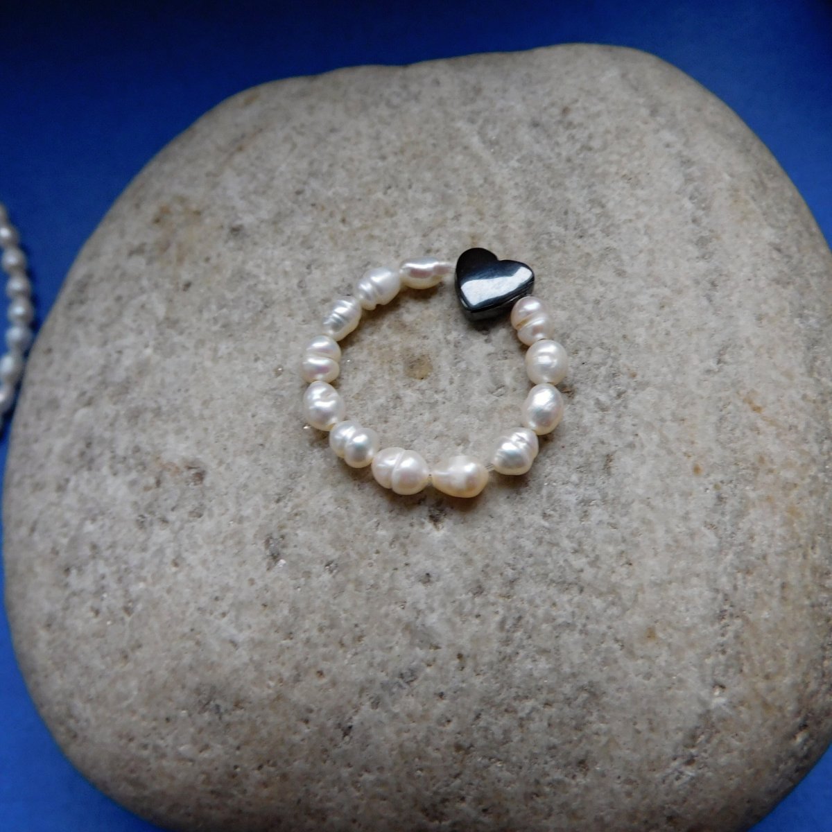 Jednoduchý prstýnek vyrobený z malinkých pravých perliček a hematitového srdíčka.