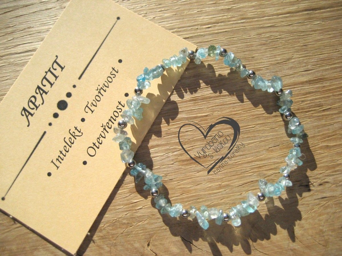 Pružný, jednoduchý, sekaný náramek na silikonové gumičce z minerálu apatit, doplněný stříbrnými korálky v patině,délka 18 - 18,5cm