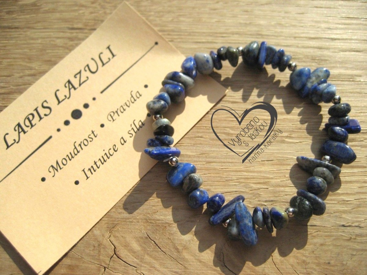 Pružný, jednoduchý, sekaný náramek na silikonové gumičce z minerálu lapis lazuli, doplněný stříbrnými korálky v patině,délka 18 - 18,5cm, cena za kus