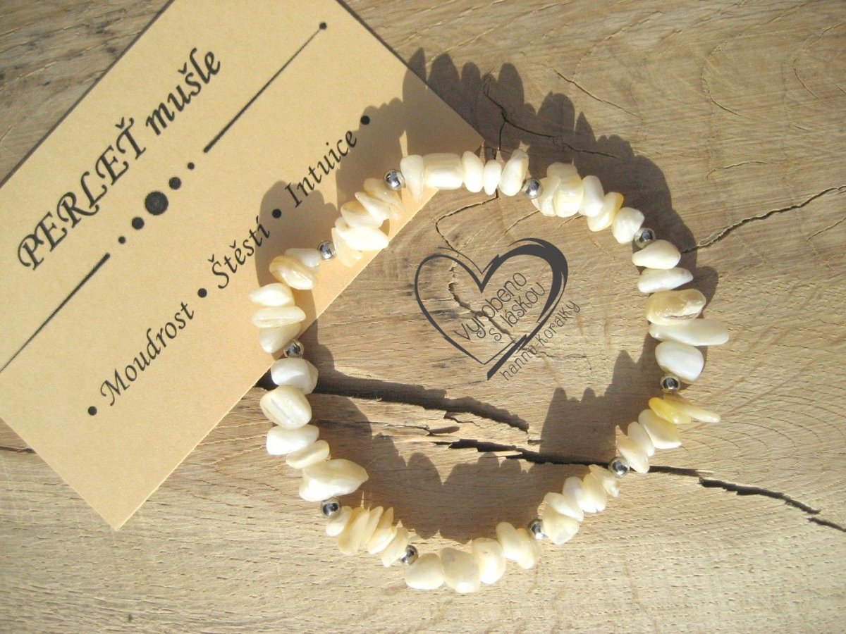 Pružný, jednoduchý, sekaný náramek na silikonové gumičce z perleti, doplněný stříbrnými korálky v patině,délka 18 - 18,5cm, cena za kus