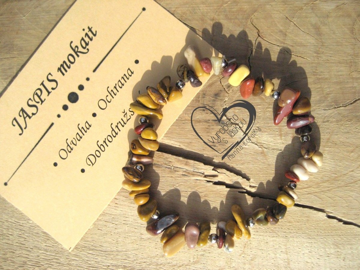 Pružný, jednoduchý, sekaný náramek na silikonové gumičce z minerálu jaspis mokait, doplněný stříbrnými korálky v patině,délka 18 - 18,5cm, cena za kus