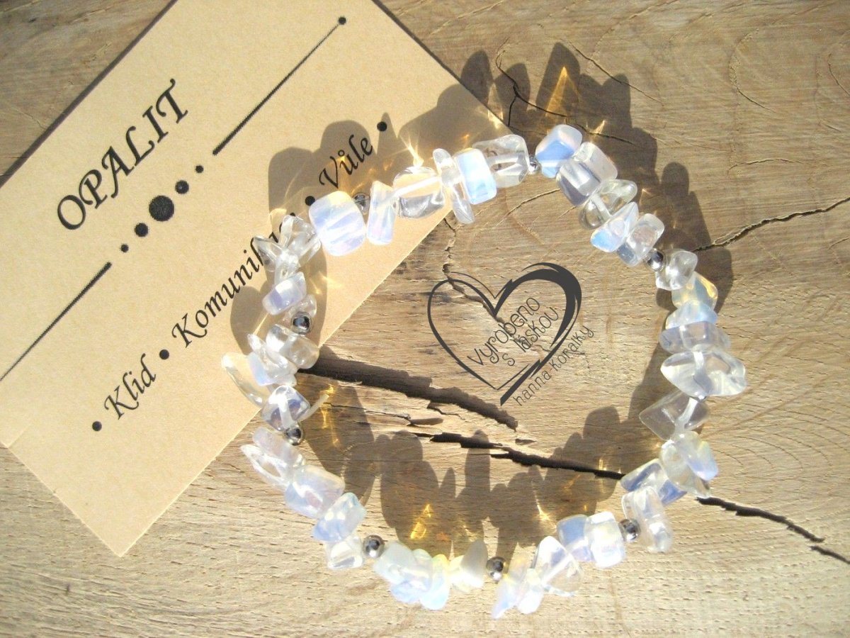 Pružný, jednoduchý, sekaný náramek na silikonové gumičce z minerálu opalit, doplněný stříbrnými korálky v patině,délka 18 - 18,5cm