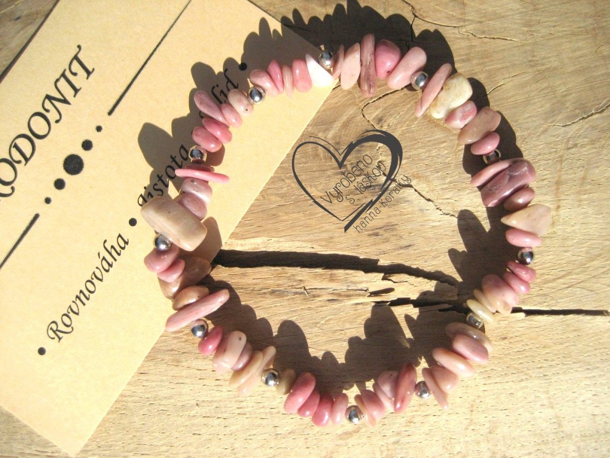 Pružný, jednoduchý, sekaný náramek na silikonové gumičce z minerálu rodonit, doplněný stříbrnými korálky v patině,délka 18 - 18,5cm