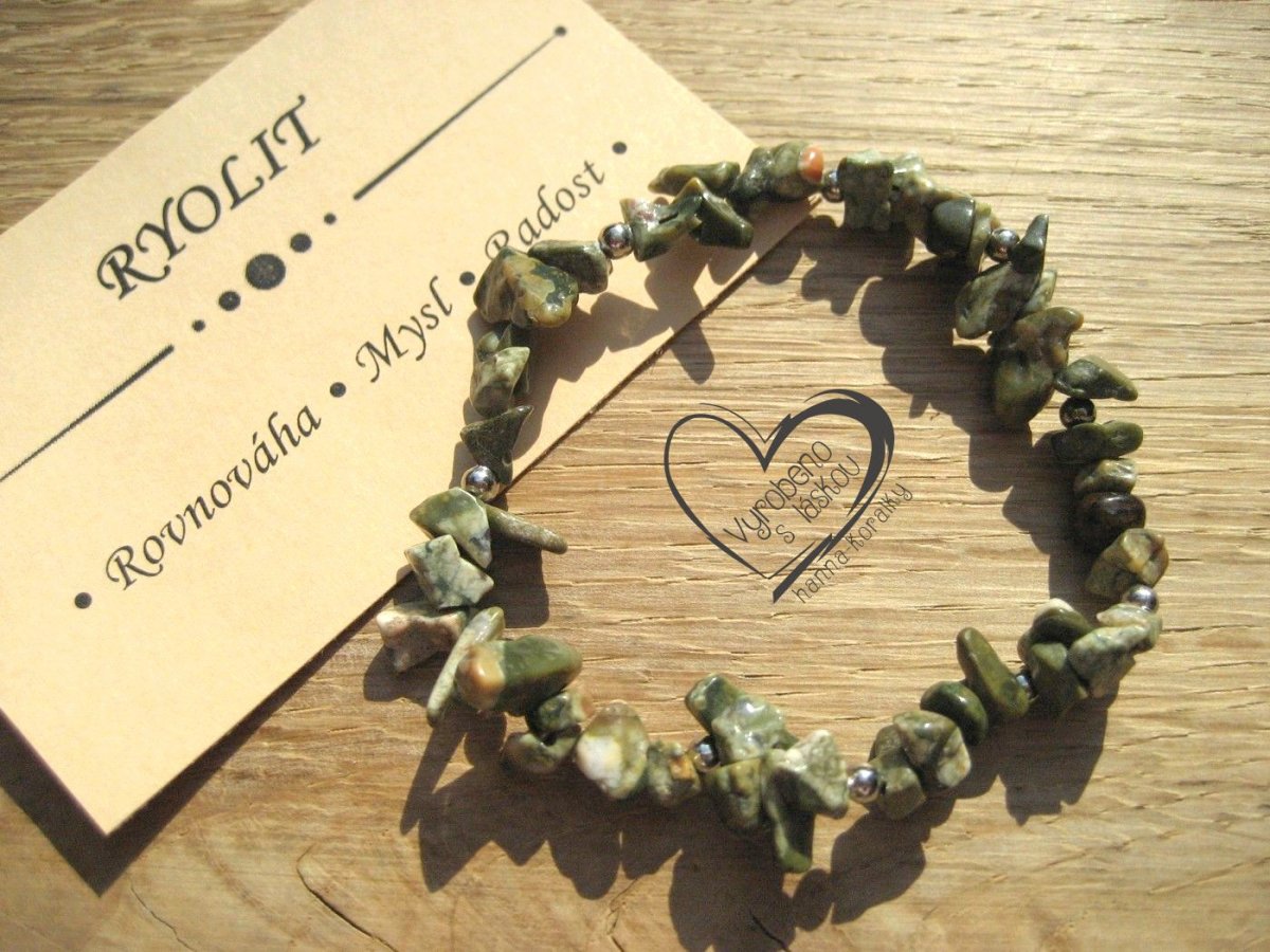 Pružný, jednoduchý, sekaný náramek na silikonové gumičce z minerálu ryolit, doplněný stříbrnými korálky v patině,délka 18 - 18,5cm