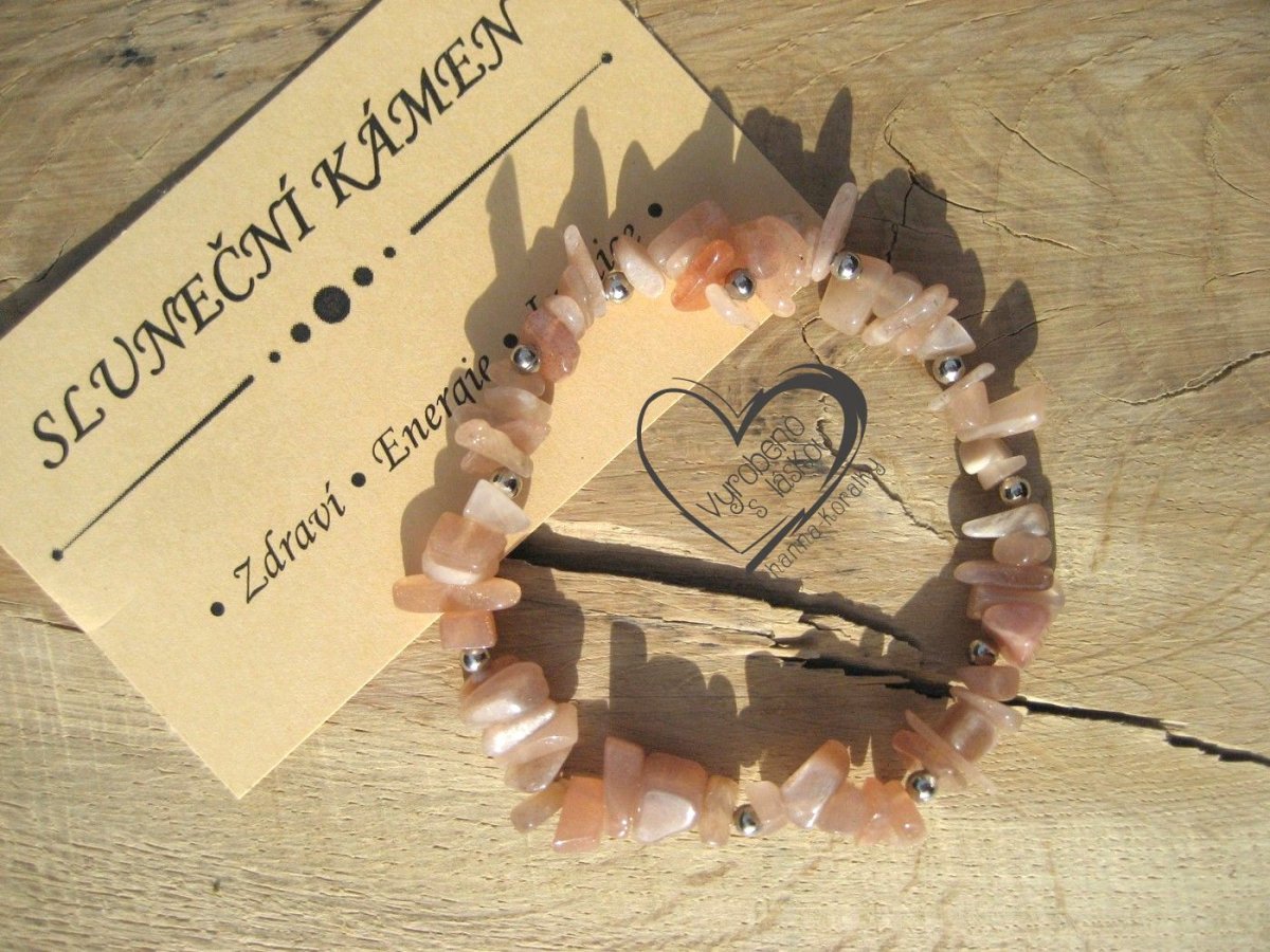 Pružný, jednoduchý, sekaný náramek na silikonové gumičce z minerálu sluneční kámen, doplněný stříbrnými korálky v patině,délka 18 - 18,5cm