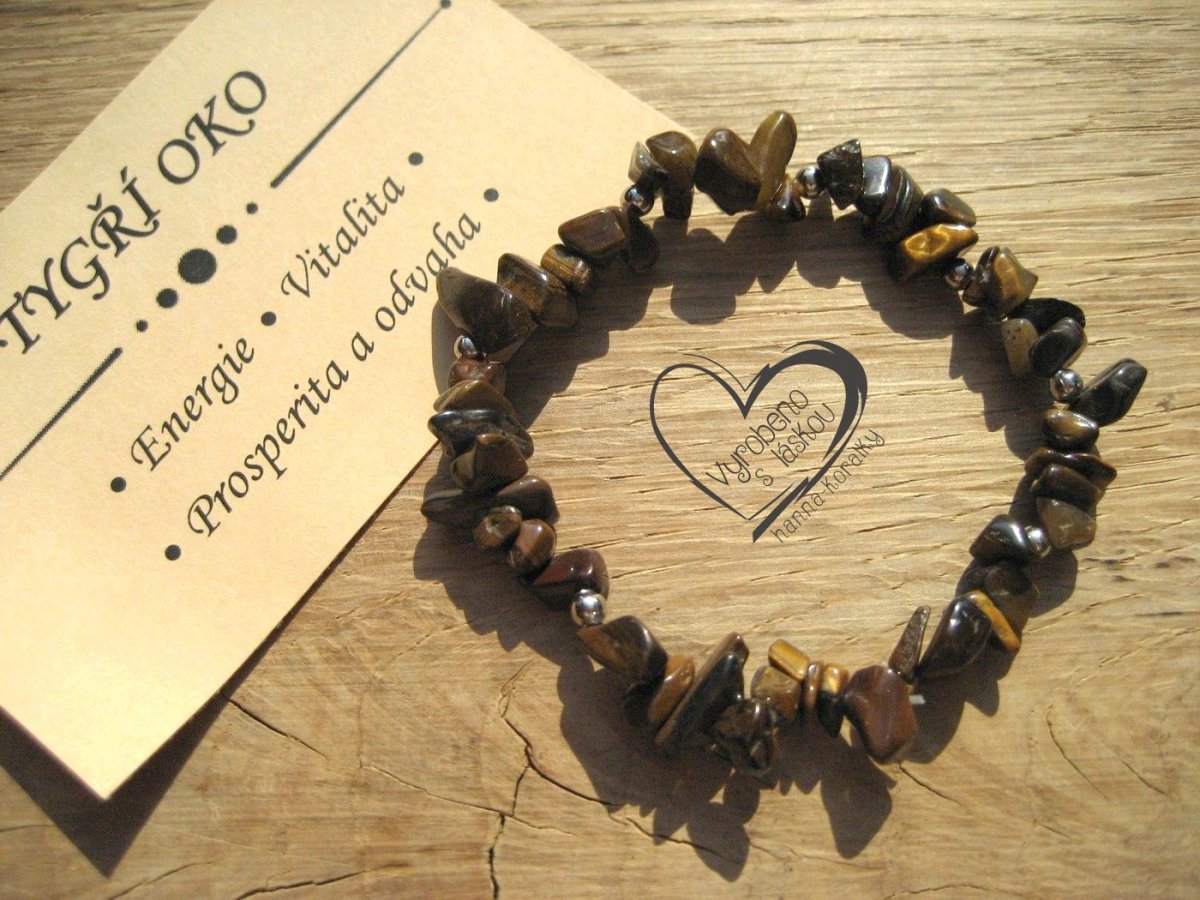 Pružný, jednoduchý, sekaný náramek na silikonové gumičce z minerálu tygří oko, doplněný stříbrnými korálky v patině,délka 18 - 18,5cm