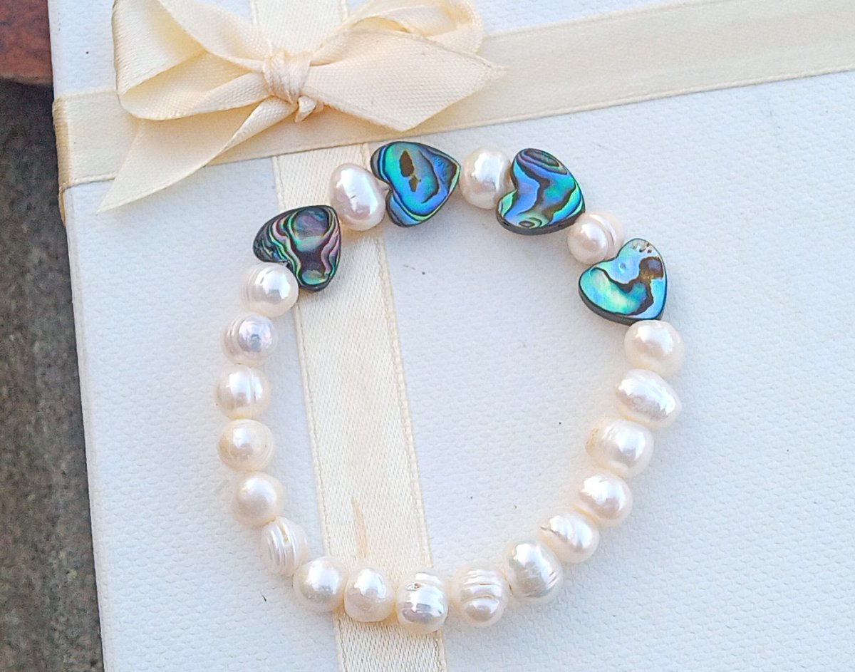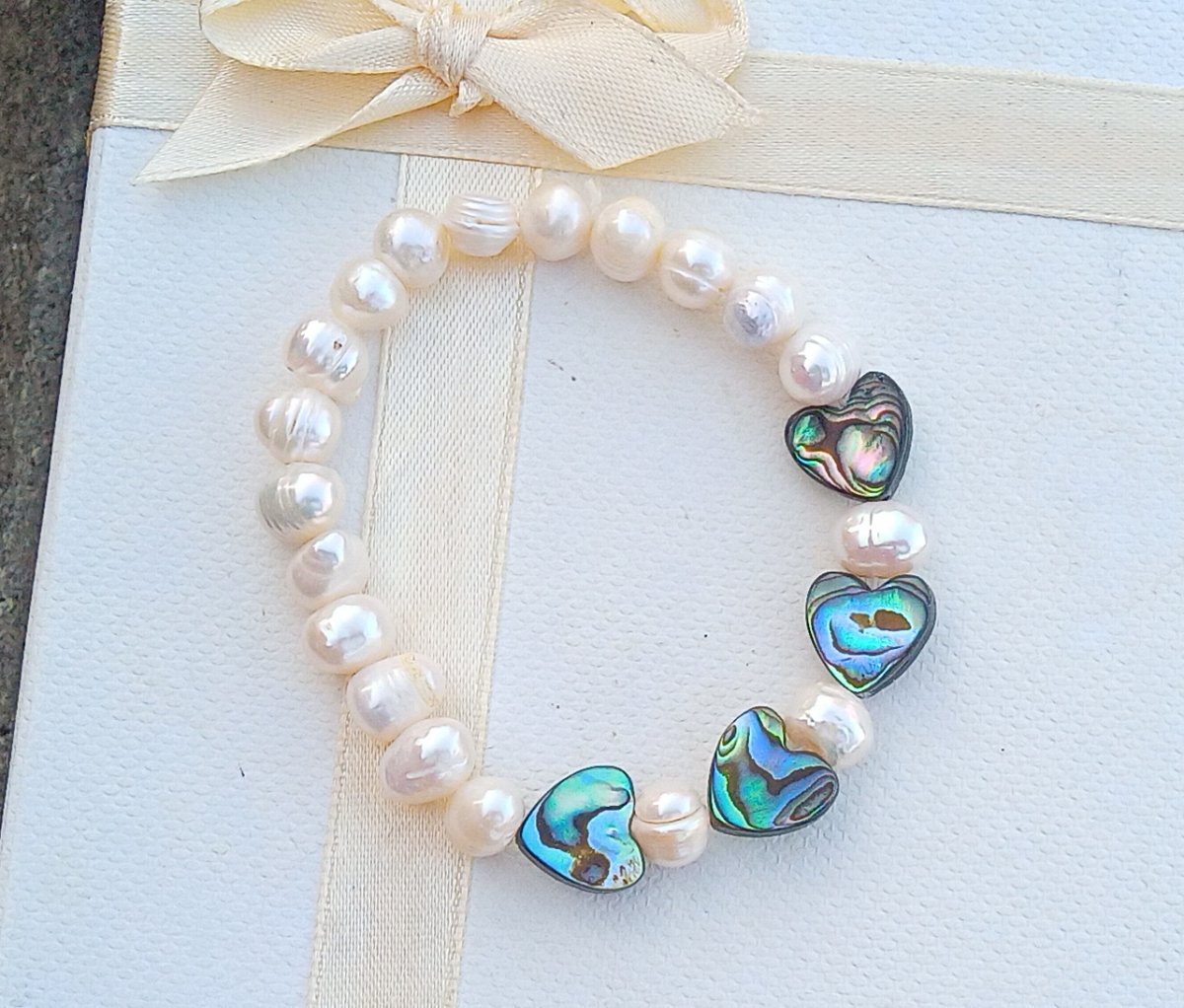 Jedinečný pružný náramek z říčních perel v kombinaci se srdíčky z Novozélandské Paua abalone perleti je okouzlujícím doplňkem, který v sobě snoubí nadčasovou eleganci a přírodní krásu. Tento šperk, často nazývaný "mořský opál", je ideální pro každodenní nošení i speciální příležitosti.