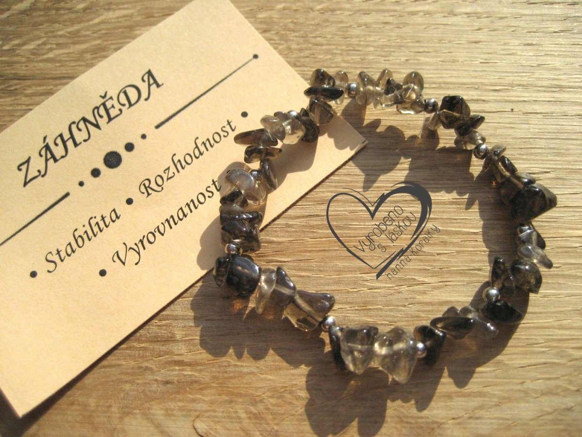 Pružný, jednoduchý, sekaný náramek na silikonové gumičce z minerálu záhněda, doplněný stříbrnými korálky v patině,délka 18 - 18,5cm, cena za kus