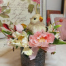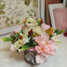 Květinové aranžmá s dekorací ptáčka v ručně malované a šablonované plechové nádobě. Květiny jsou látkové a umělé, umístěné v aranžovací hmotě.