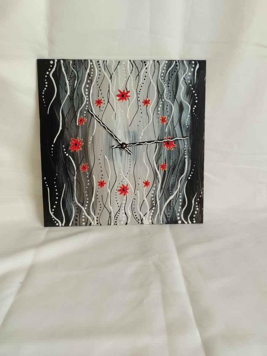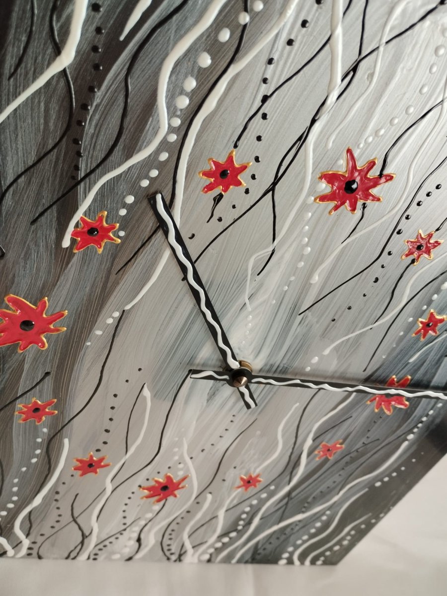 Základ tvoří propracovaná abstraktní malba v tónech černé, šedé a bílé. Dynamické vlnovky a jemné tečkování vytvářejí hloubku, kterou rozbíjí dvanáct ručně malovaných červených květů (bodů), jež slouží jako indexy. Každý tah štětcem je originál, což zaručuje, že nikdo jiný nebude mít naprosto stejný kus.