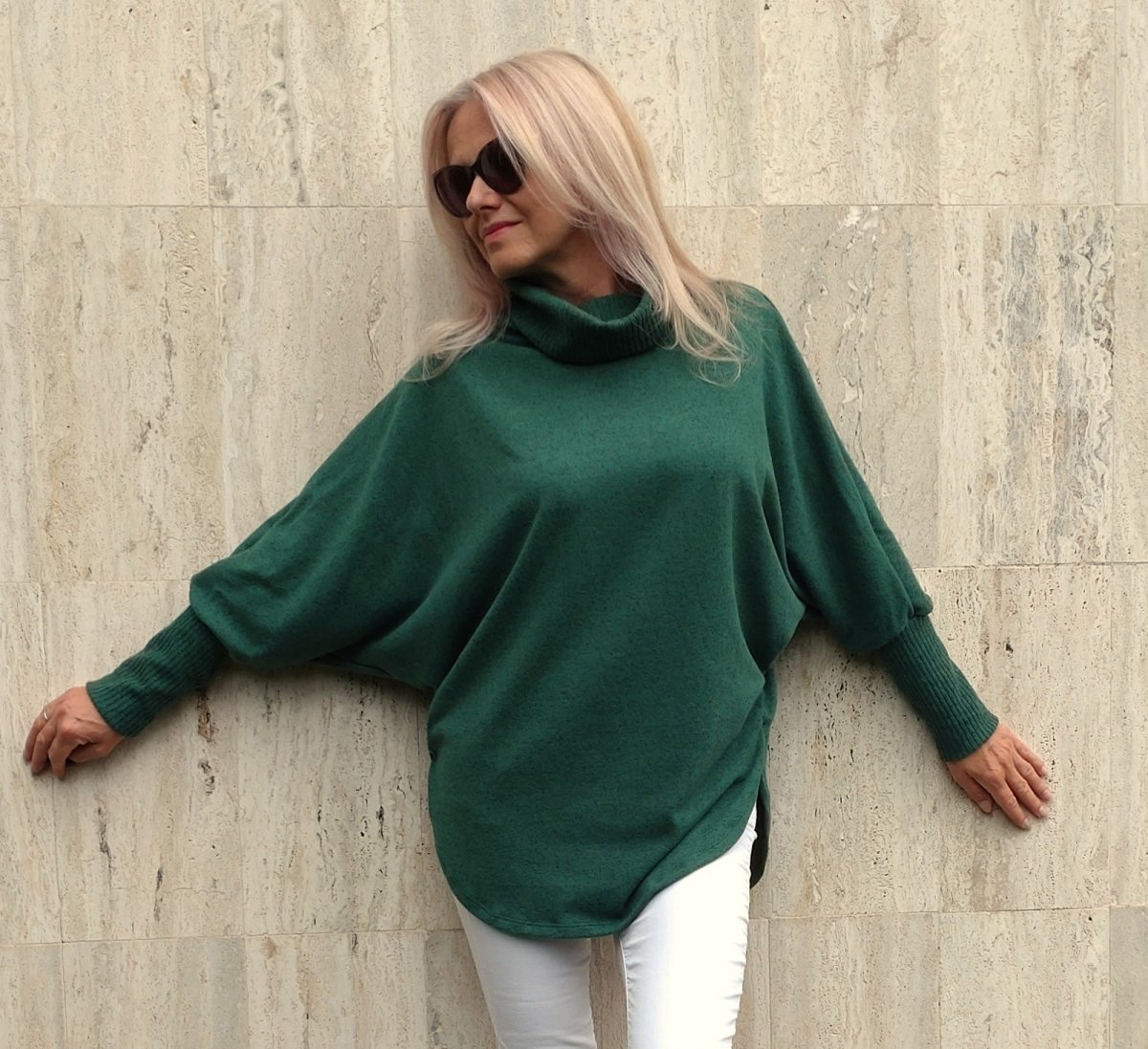 Pohodlný pulovr ve stylu ponča. Narozdíl od ponča má rukávy.