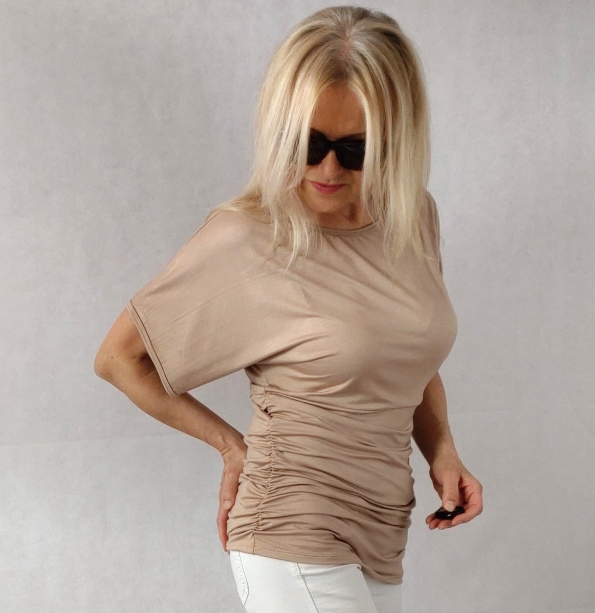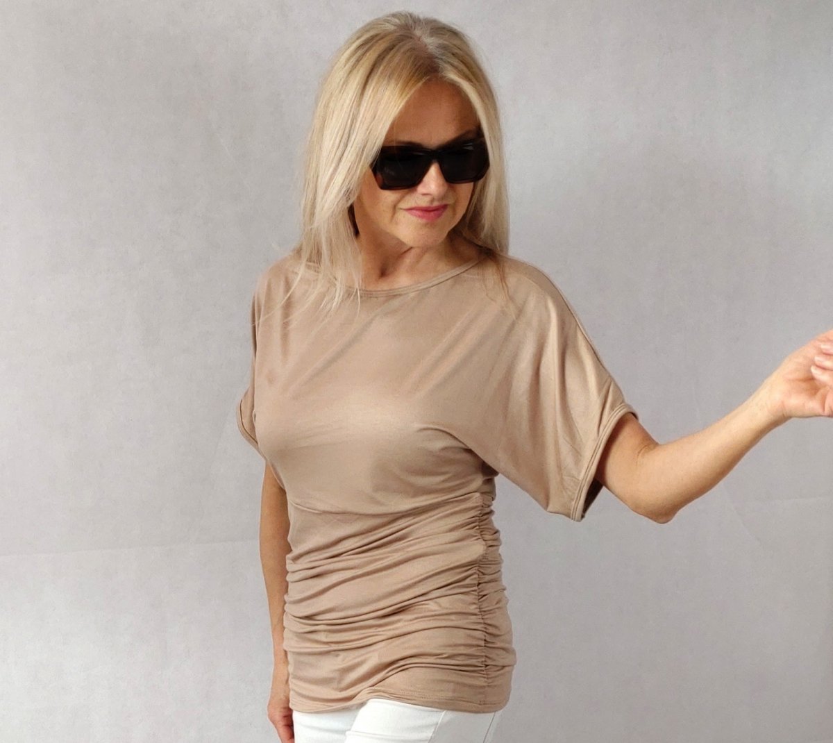 Široké rukávy, netopýří střih, V bocích husté zřasení. Elastický úplet viscóza s lycrou.