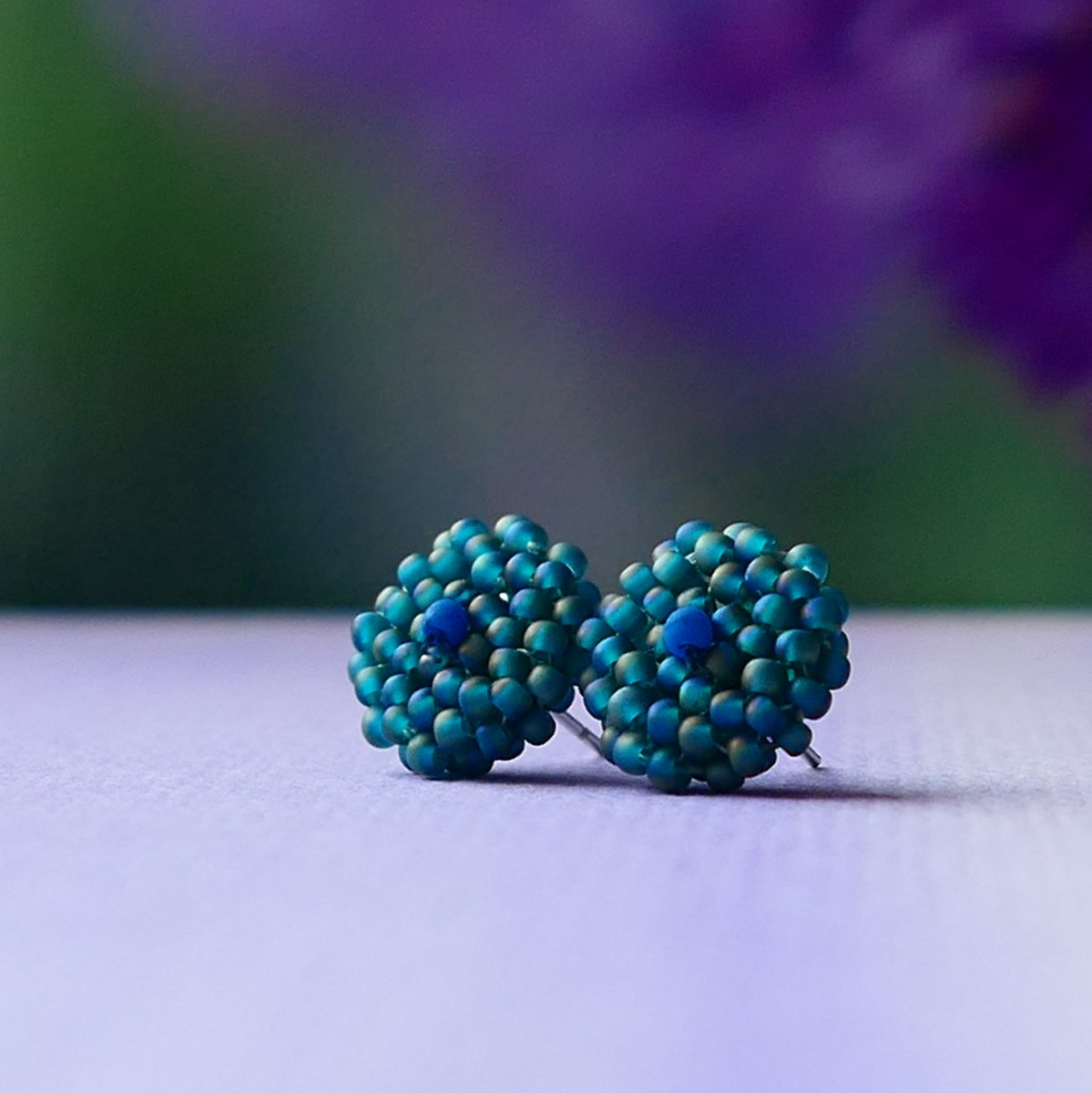 Ušito z japonského rokailu Toho barvy šedo modré, matné, šito nití nymo. Uprostřed matný modrý korálek.
