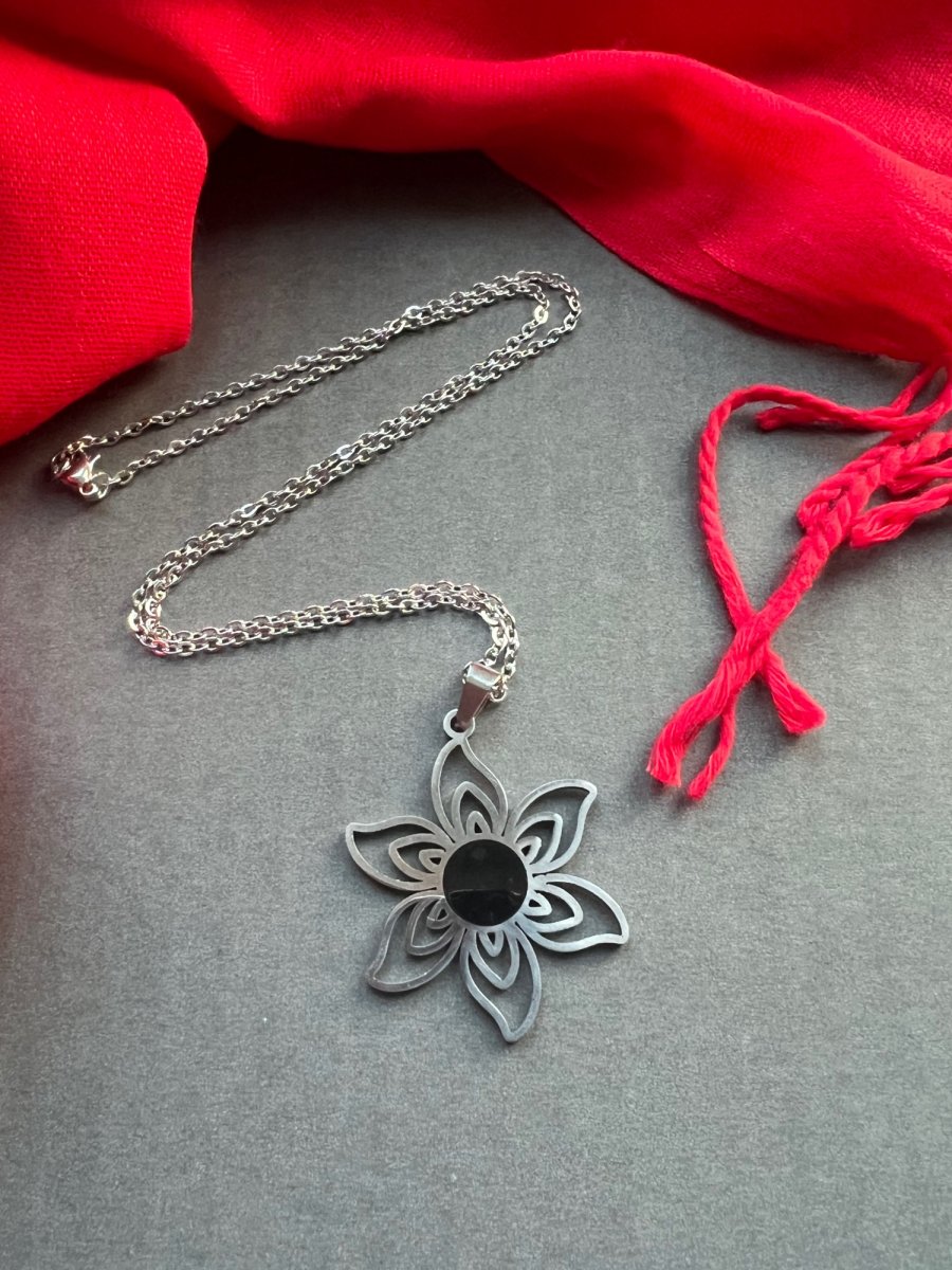 Jemný řetízek s přívěskem květiny s černým středem - cca 3,5 cm. Řetízek má délku 45 cm a na zapínání karabinku. Řetízek a veškeré kovové komponenty jsou z nerez oceli - nemění barvu a je vhodný i pro alergiky