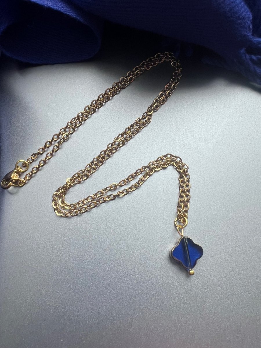 Jemný řetízek s drobným skleněným přívěskem - cca 1cm. Řetízek má délku 45 cm a na zapínání karabinku. Řetízek a veškeré kovové komponenty jsou z pozlacené nerez oceli - nemění barvu a je vhodný i pro alergiky