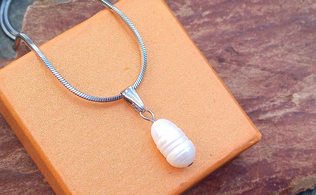Bílá dokonale lesklá velká říční perla o velikosti 15 mm zavěšená na hadovitém řetízku z chirurgické oceli - hypoalergenní, vhodný i pro alergiky. Délka řetízku 40 cm. V případě zájmu mohu přidělat prodlužovací řetízek.